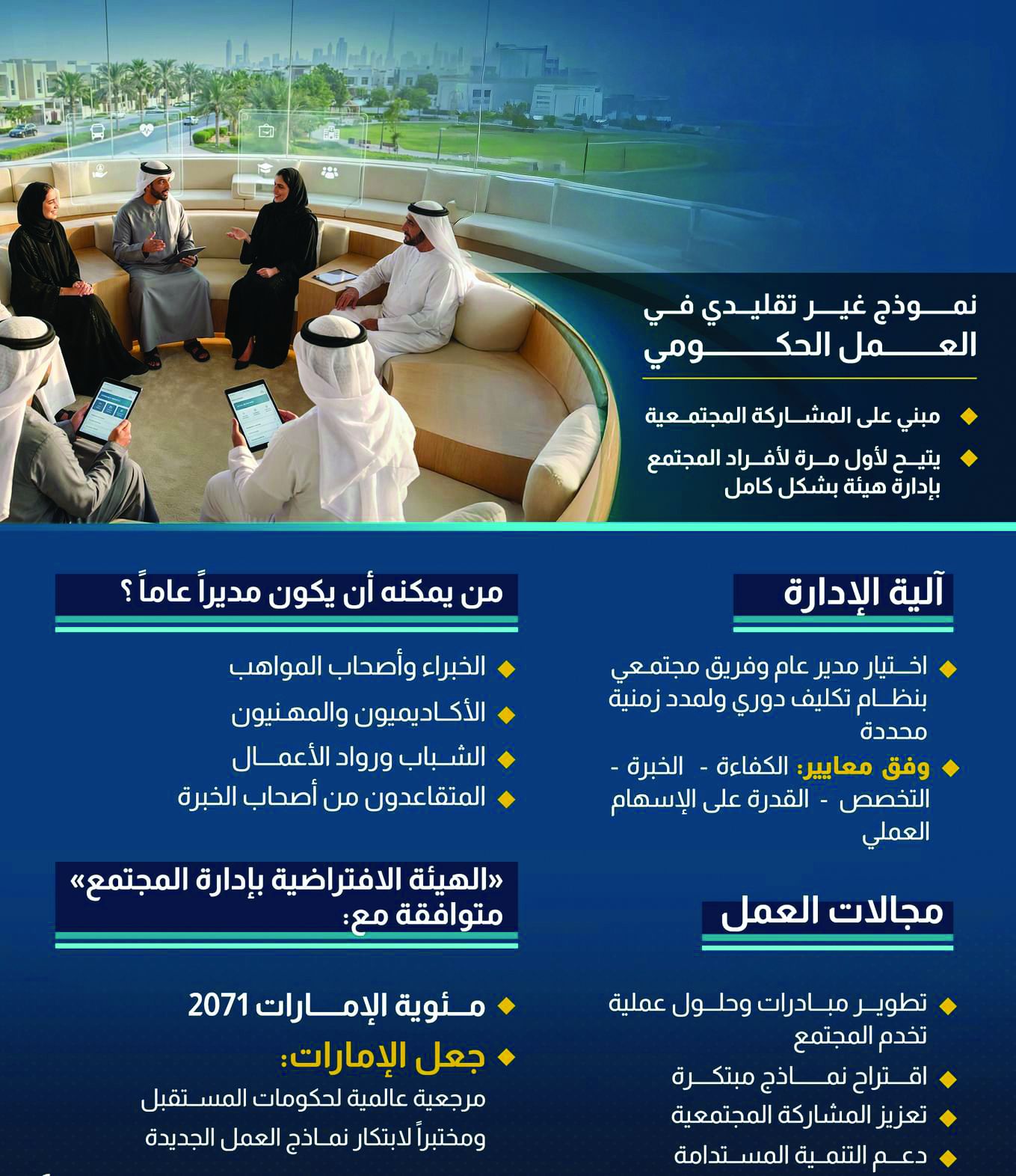 وتعتبر «الهيئة الافتراضية بإدارة المجتمع» نموذجاً غير تقليدي في العمل الحكومي المبني على المشاركة المجتمعية، حيث يتيح النموذج، للمرة الأولى، لأفراد مجتمع الإمارات، من أصحاب المهارات والكفاءات، إدارة الهيئة بشكل كامل، حيث سيُعين المدير العام والفريق المعني من أفراد المجتمع بصورة دورية لإدارة الهيئة، والعمل على مهامها، وتطوير مخرجاتها ذات القيمة الحقيقية التي تخدم الوطن.
