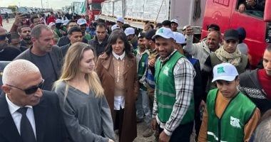 النجمة العالمية أنجلينا جولي تتفقد معبر رفح، وسط اصطفاف قوافل المساعدات المصرية