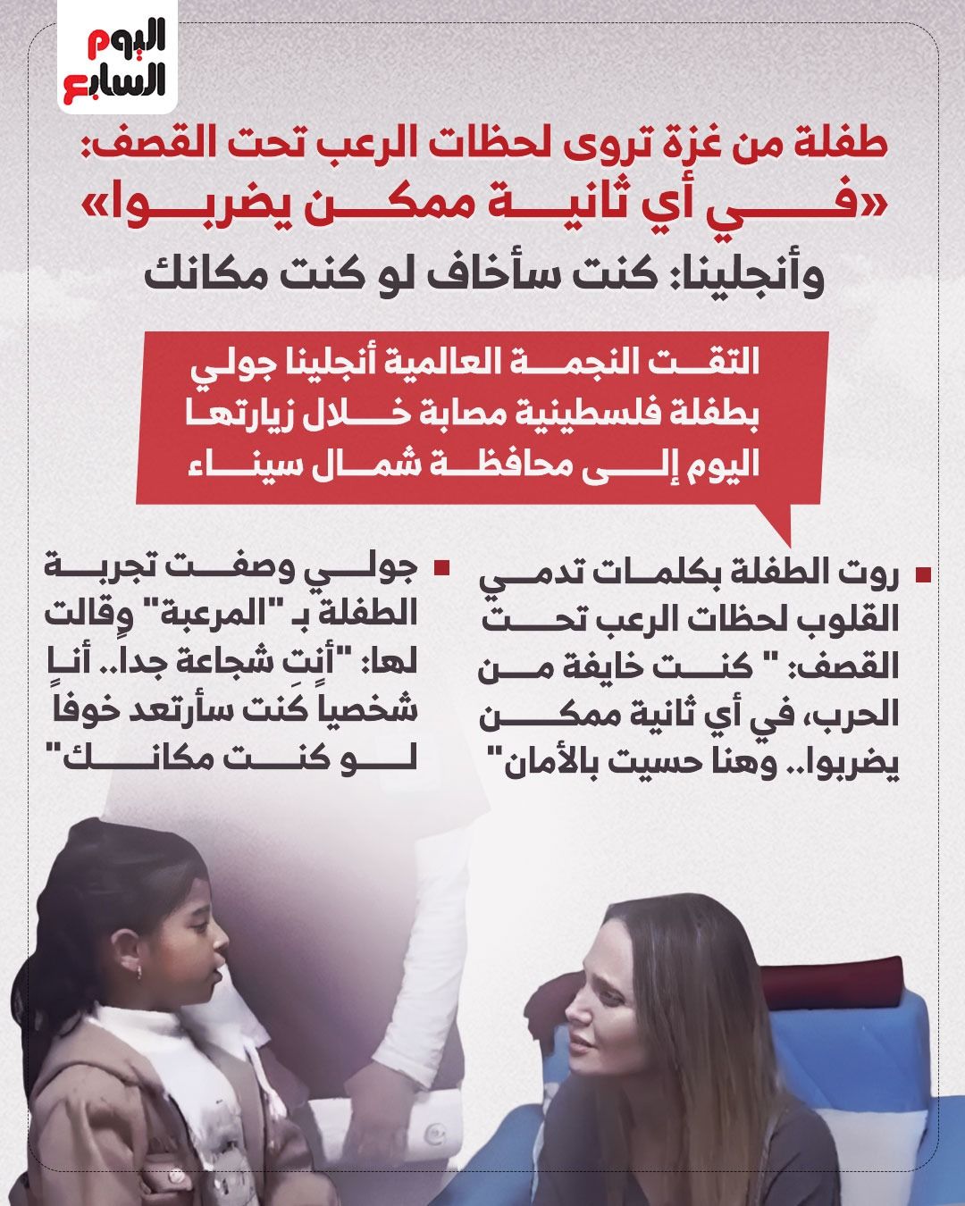 وفي أبرز محطات الزيارة الإنسانية، التقت جولي بعدد من الجرحى والمصابين الفلسطينيين، ووثق مقطع فيديو "حواراً مؤثراً" جمع بين النجمة العالمية وطفلة فلسطينية مصابة، حيث استمعت جولي بتركيز شديد لشهادة الطفلة حول أهوال الحرب، وعبرت الطفلة بكلمات تدمي القلوب عن حالة الرعب الدائم وفقدان الأمان، قائلة إن الخطر كان يلاحقهم في كل ثانية.