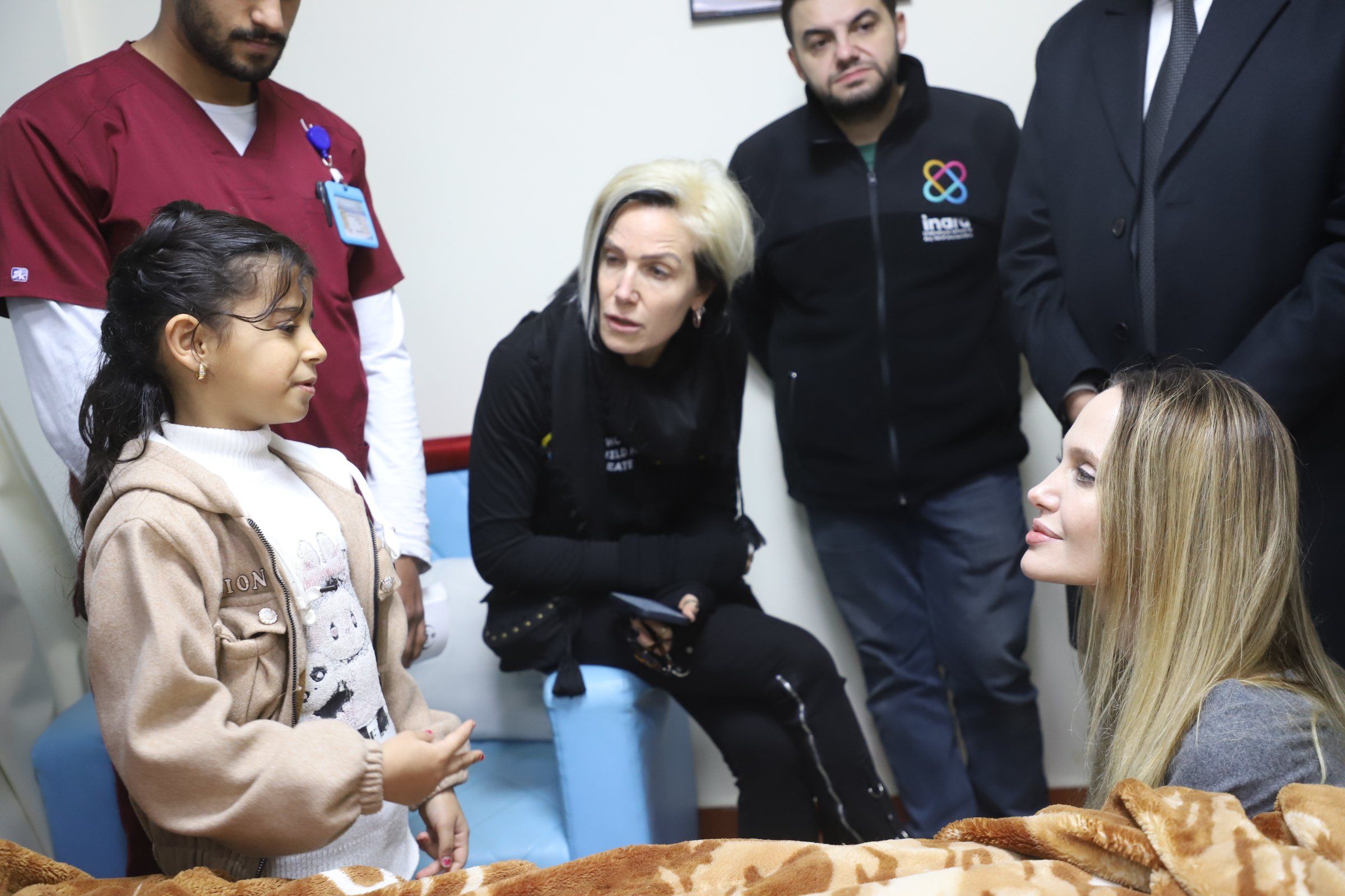 الجلوس على الأرض والاستماع إلى طفلة فلسطينيةخلال زياره مستشفي العريش قامت النجمه العالميه بالاستماع بكل حزن لاحدي قصص المصابين ووجدت نفسها تجلس ع الارض وسط تاثر شديد وبعدالانتهاء قامت بتقبيل الطفله