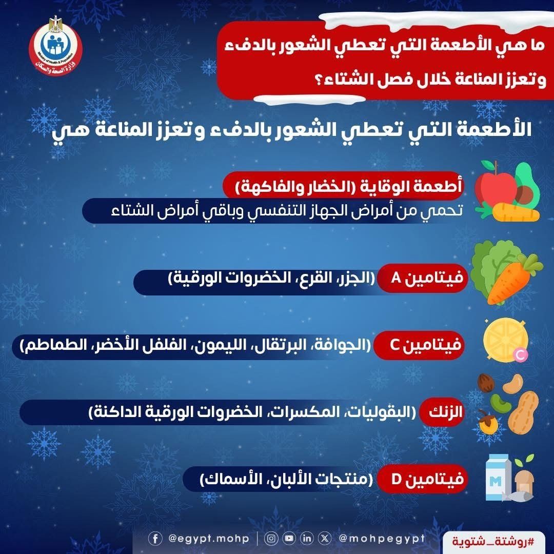 وقالت وزارة الصحة والسكان : الأطعمة التي تعطي الشعور بالدفء وتعزز المناعة تتضمن :-