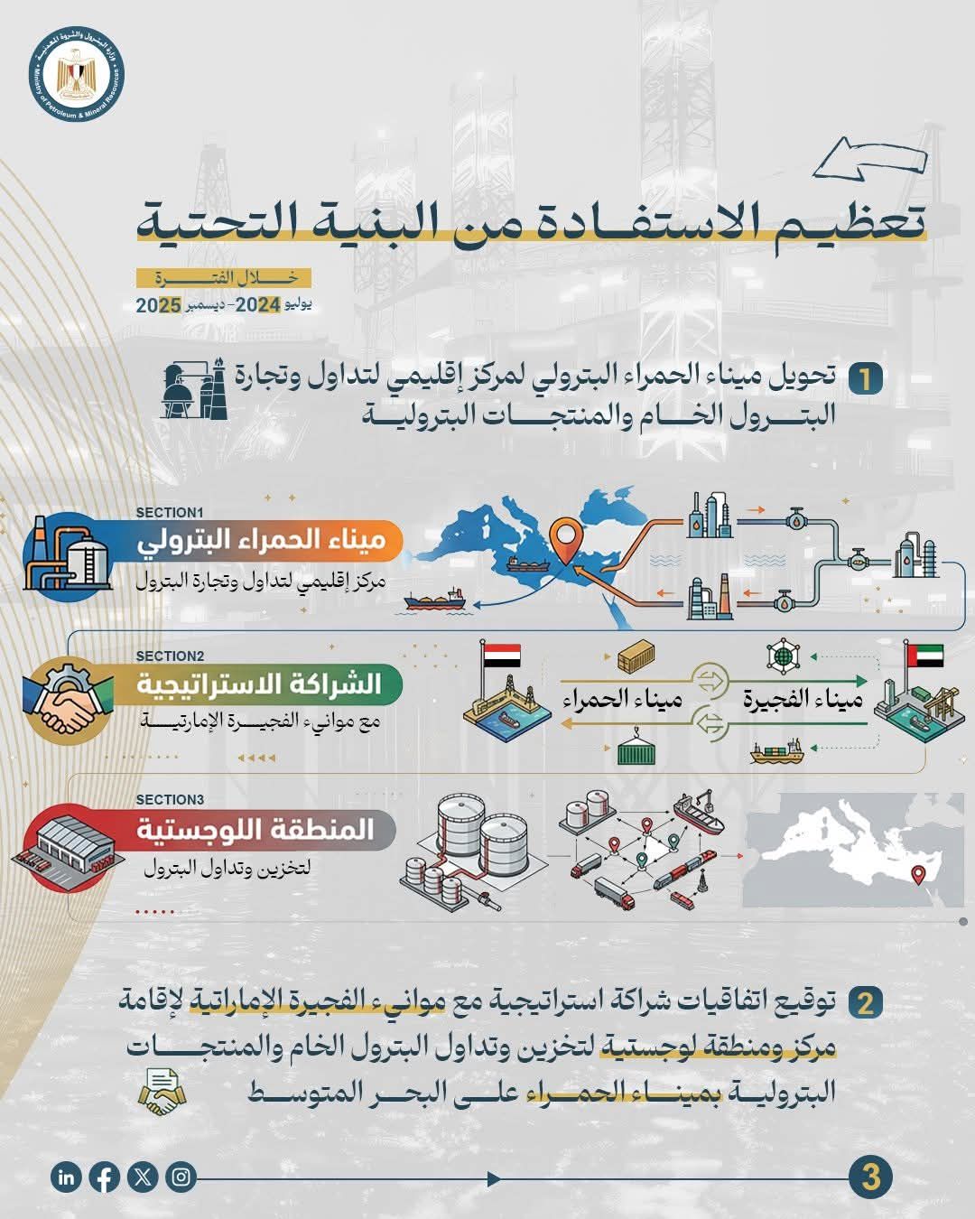 5-توقيع اتفاقيات تطوير ميناء الحمراء البترولي بالعلمين الجديدة وتحويله لمركز إقليمي علي ساحل البحر المتوسط لتخزين وتداول وتجارة البترول الخام والمنتجات البترولية، وذلك بالتعاون مع موانئ الفجيرة الإماراتية التي تعد ثاني أكبر مركز عالميا في هذا المجال .