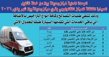 وأشارت «بركات» إلى أن سيارة المركز التكنولوجي المتنقل تنطلق في جولة ميدانية شاملة تغطي مدينة بيلا وقرى المركز وفق خطة زمنية، حيث تبدأ أعمالها داخل مدينة بيلا خلال الفترة من 4 إلى 8 يناير، متنقلة يوميًا بين نقاط حيوية لخدمة أكبر شريحة من المواطنين.