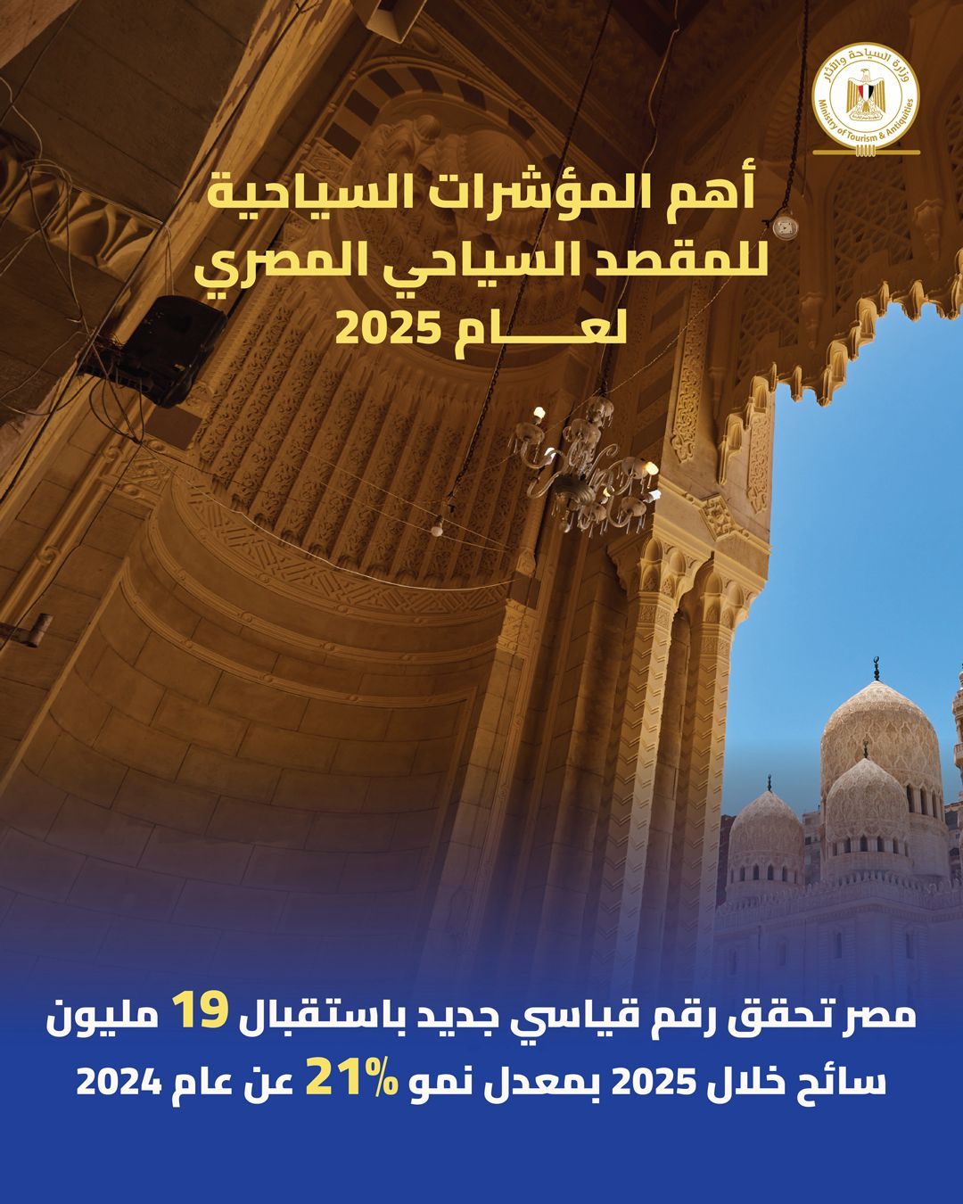 سجلت السياحة المصرية خلال عام 2025 أداءً استثنائيًا وغير مسبوق، حيث استقبلت مصر نحو 19 مليون سائح، محققة رقمًا قياسيًا جديدًا بمعدل نمو بلغ 21% مقارنة بعام 2024، في إنجاز يعكس القوة المتنامية للمقصد السياحي المصري على الساحة الدولية.