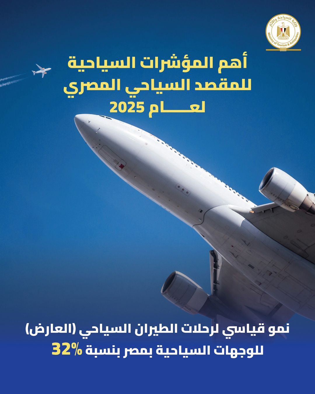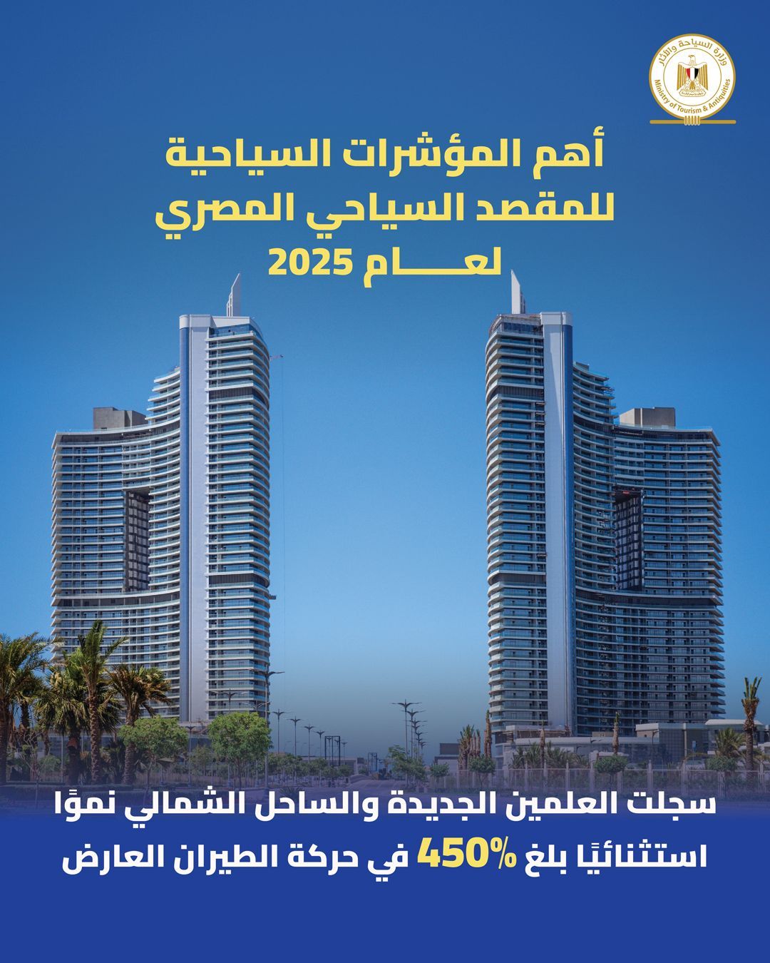 كما شهد عام 2025 نموًا ملحوظًا في رحلات الطيران السياحي (العارض) بنسبة 32%، في حين حققت مدينة العلمين الجديدة قفزة استثنائية، مسجلة نموًا بنسبة 450% في حركة الطيران العارض، لتكون أحد أبرز المقاصد السياحية الجديدة على خريطة السياحة الدولية.