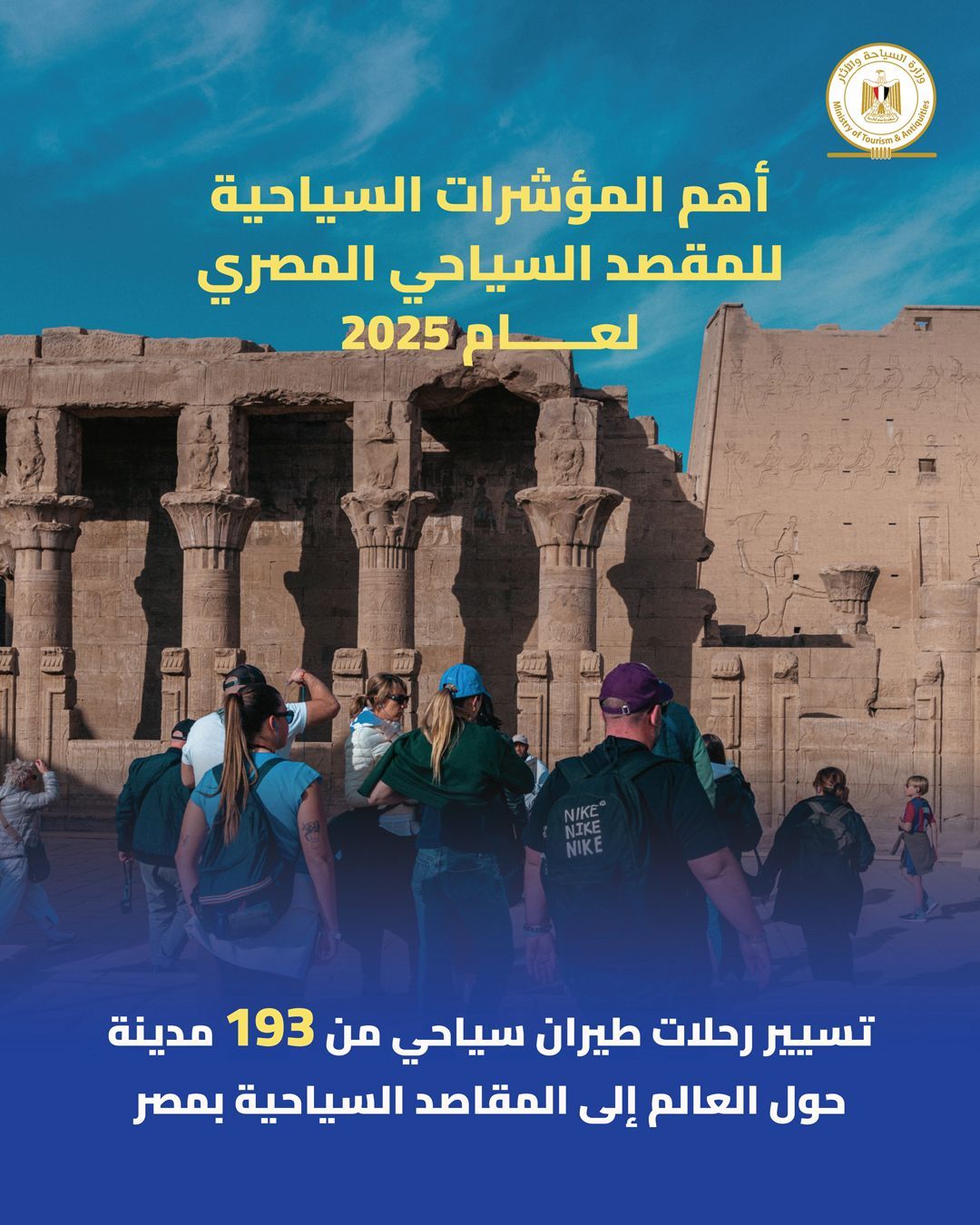 كما تم، خلال عام 2025، تسيير رحلات طيران سياحية من 193 مدينة حول العالم إلى المقاصد السياحية المصرية المختلفة، في مؤشر واضح على اتساع شبكة الطيران الدولية وزيادة الإقبال على زيارة مصر.