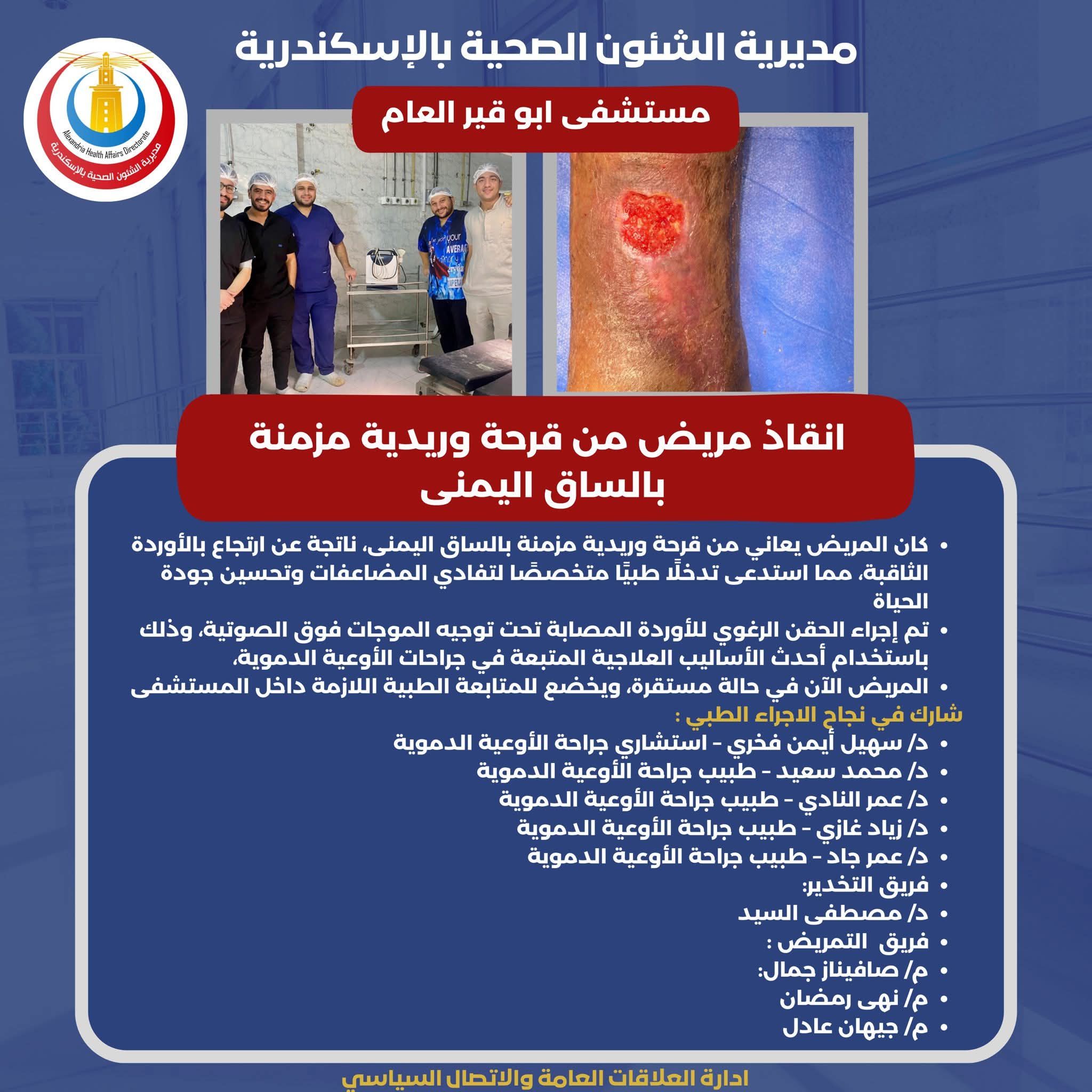 وتم إجراء الحقن الرغوي للأوردة المصابة تحت توجيه الموجات فوق الصوتية، وذلك باستخدام أحدث الأساليب العلاجية المتبعة في جراحات الأوعية الدموية، المريض الآن في حالة مستقرة، ويخضع للمتابعة الطبية اللازمة داخل مستشفى أبوقير العام ، شارك في نجاح الاجراء الطبي دكتورة سهيل أيمن فخري ، استشاري جراحة الأوعية الدموية، دكتور محمد سعيد طبيب جراحة الأوعية الدموية، دكتور عمر النادي طبيب جراحة الأوعية الدموية دكتزر زياد غازي طبيب جراحة الأوعية الدموية، دكتور عمر جاد طبيب جراحة الأوعية الدموية فريق التخدير دكتور مصطفى السيد ، فريق التمريض صافيناز جمال، نهى رمضان ، جيهان عادل.