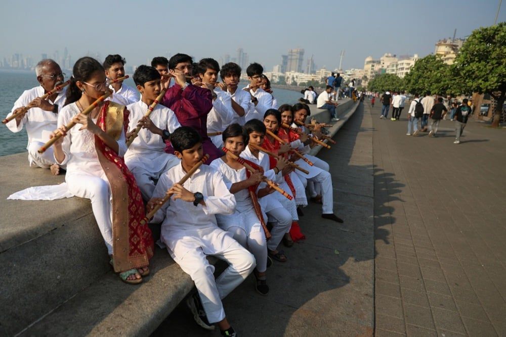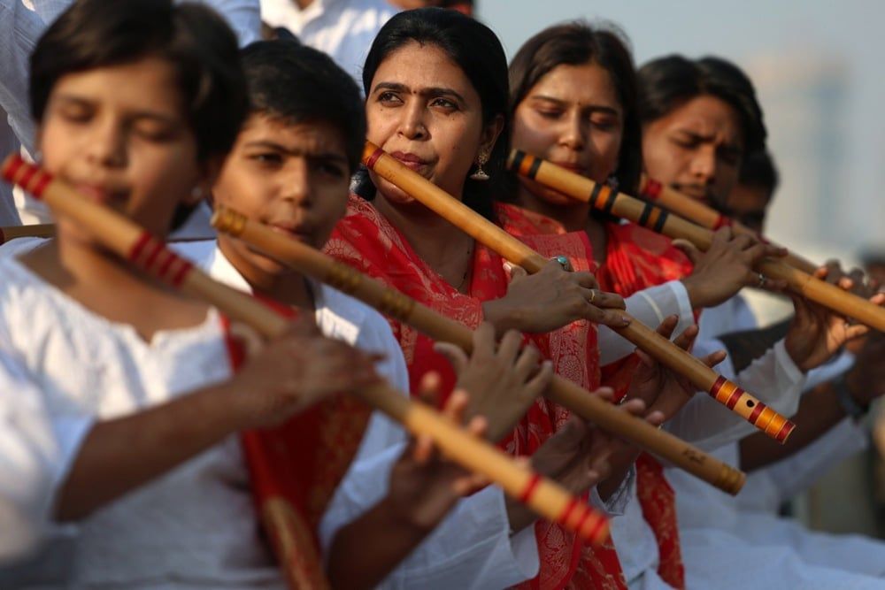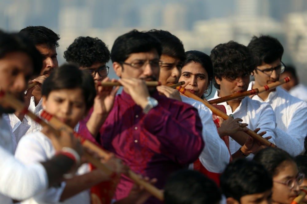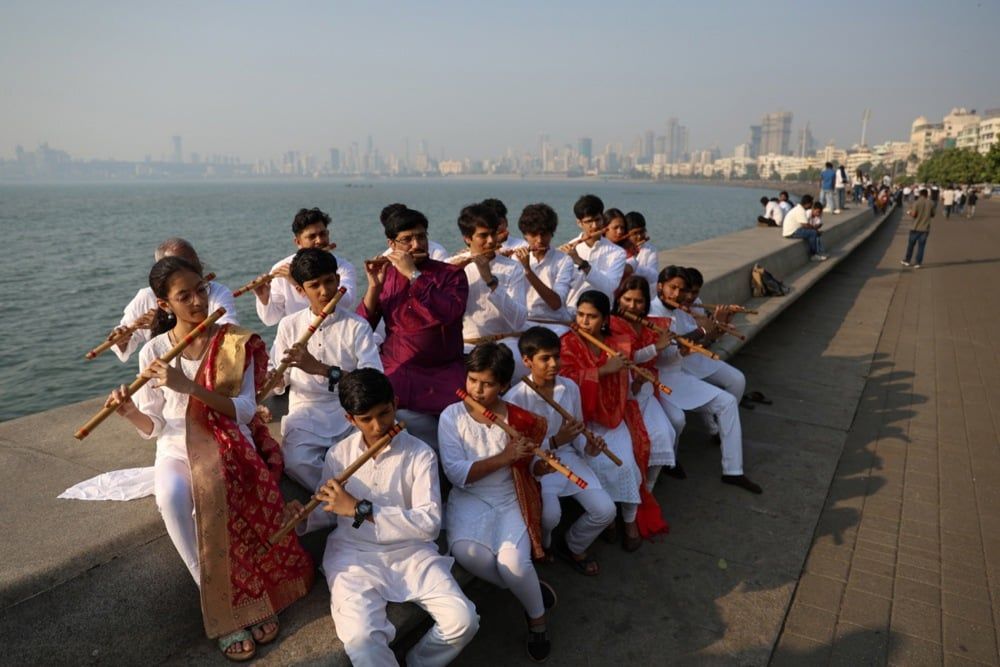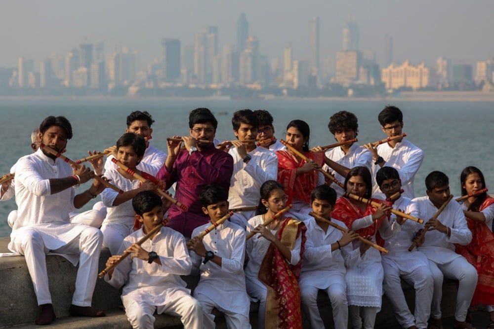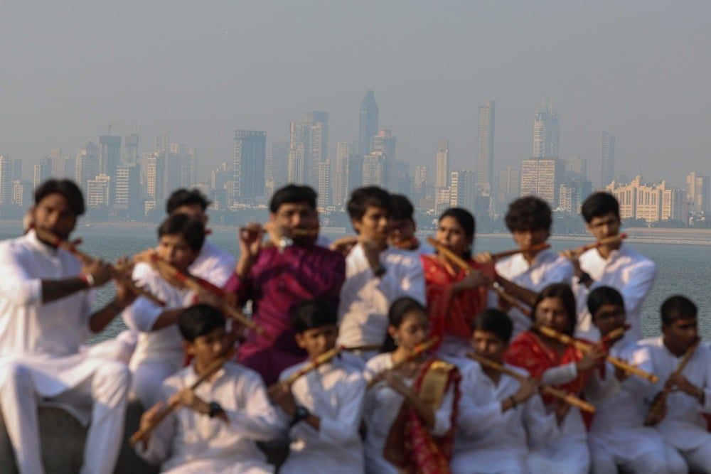 عازفو الفلوت الهنود يتدربون في منطقة مارين درايف في مومباي استعداداً لعزف سيمفونية الفلوت (1)