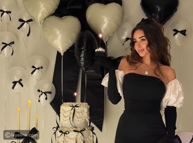 ولعب ديكور الاحتفال دورًا مهمًا في إبراز الإطلالة، إذ جاء معتمدًا على اللونين الأسود والأبيض، سواء في البالونات أو تفاصيل الزينة وتورتة عيد الميلاد، ما خلق انسجامًا بصريًا واضحًا بين المكان والإطلالة، وجعل الصور تبدو كأنها لوحة متكاملة بعناية.