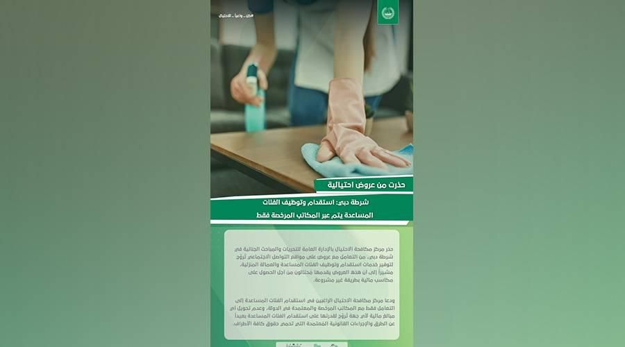 حذر مركز مكافحة الاحتيال بالإدارة العامة للتحريات والمباحث الجنائية في شرطة دبي، من التعامل مع عروض على مواقع التواصل الاجتماعي تُروِّج لتوفير خدمات استقدام وتوظيف الفئات المساعدة والعمالة المنزلية، مشيراً إلى أن هذه العروض يقدمها مُحتالون من أجل الحصول على مكاسب مالية بطريقة غير مشروعة.