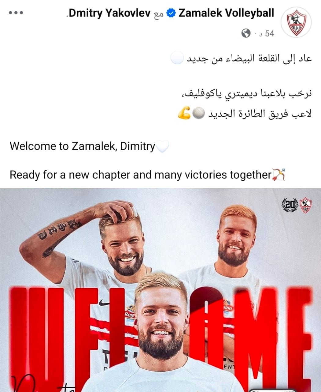 الثلاثاء، 06 يناير 2026 08:10 مرحبت الصفحة الرسمية لكرة طائرة الزمالك بالروسى ديميترى ياكوفليف لاعب الفريق السابق بعد عودته مرة أخرى لصفوف الفريق.