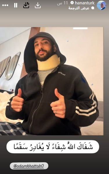 حرصت الفنانة المعتزلة حنان ترك، على مشاركة متابعيها وجمهورها صورة لابنها ادم، بعد اصابته في رقبته، بعد أيام من زفافه، وكتبت "شفاك الله شفاء لا يغادر سقما"، وسرعان ما انهالت التعليقات والمنشورات بالدعوات لابنها.