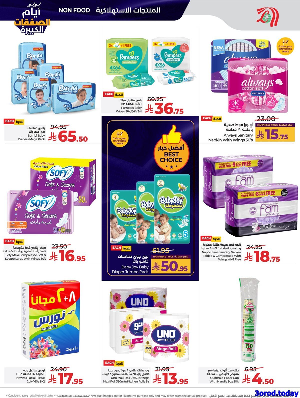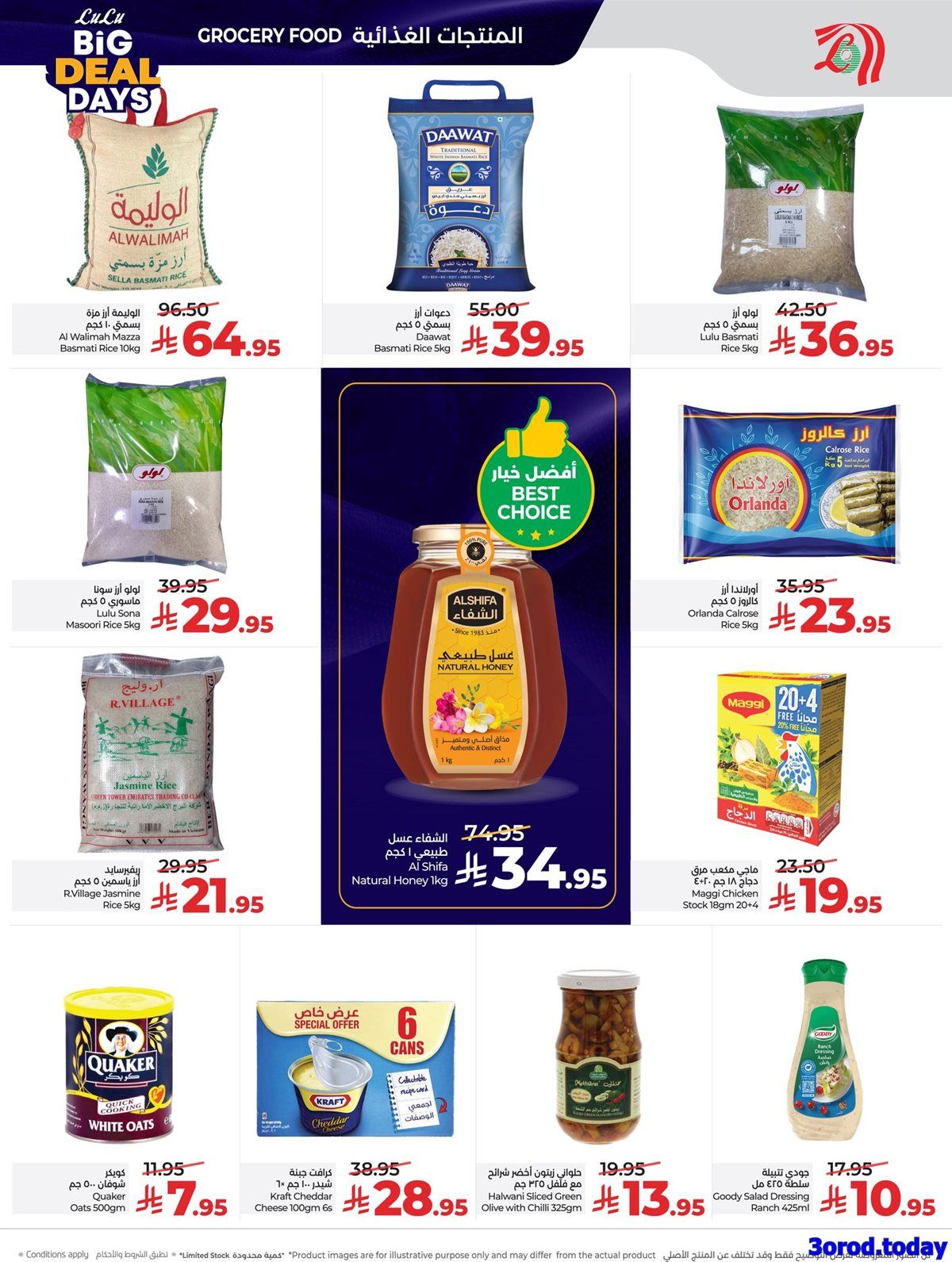 عروض لولو الرياض الأربعاء 18 رجب 1447هـ الموافق 7-1-2026 و تشمل زبدة الفول السوداني والعسل الخام والحليب طويل الأجل والجبن واللبنة والفواكه المجففة و اللحوم الطازجة و تشكيلة من المنتجات الاساسية ثم تشمل الأجهزة مثل قلاية هوائية وسخان ماء ومفرمة خضار كهربائية و شاشات التلفزيون و احدث الجوالات .