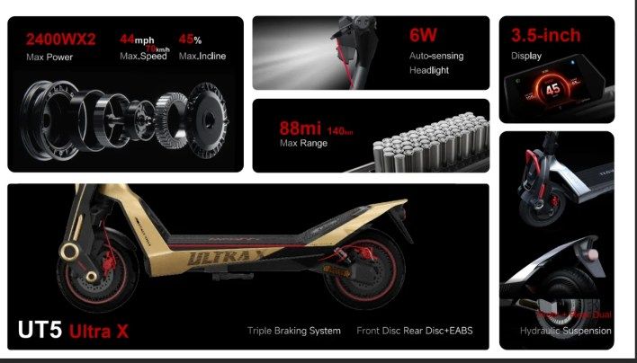 يتميز طراز UT5 Ultra X بمواصفات إضافية غير موجودة في إصدار Max، تشمل مصباحاً أمامياً أقوى بقدرة 12 واط، وبوقاً إلكترونياً، ومكابح قرصية زيتية (oil disc brakes) أمامية وخلفية، ومقاومة توجيه قابلة للتعديل.