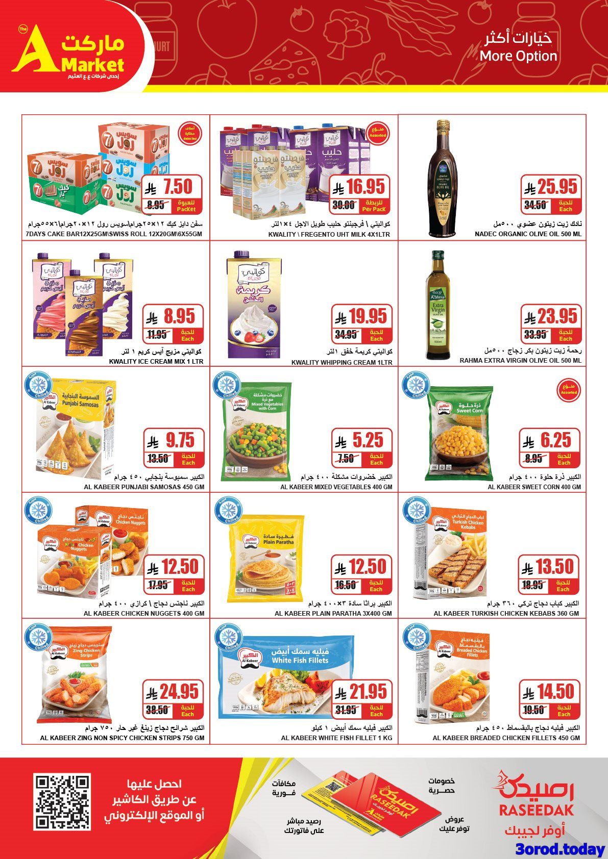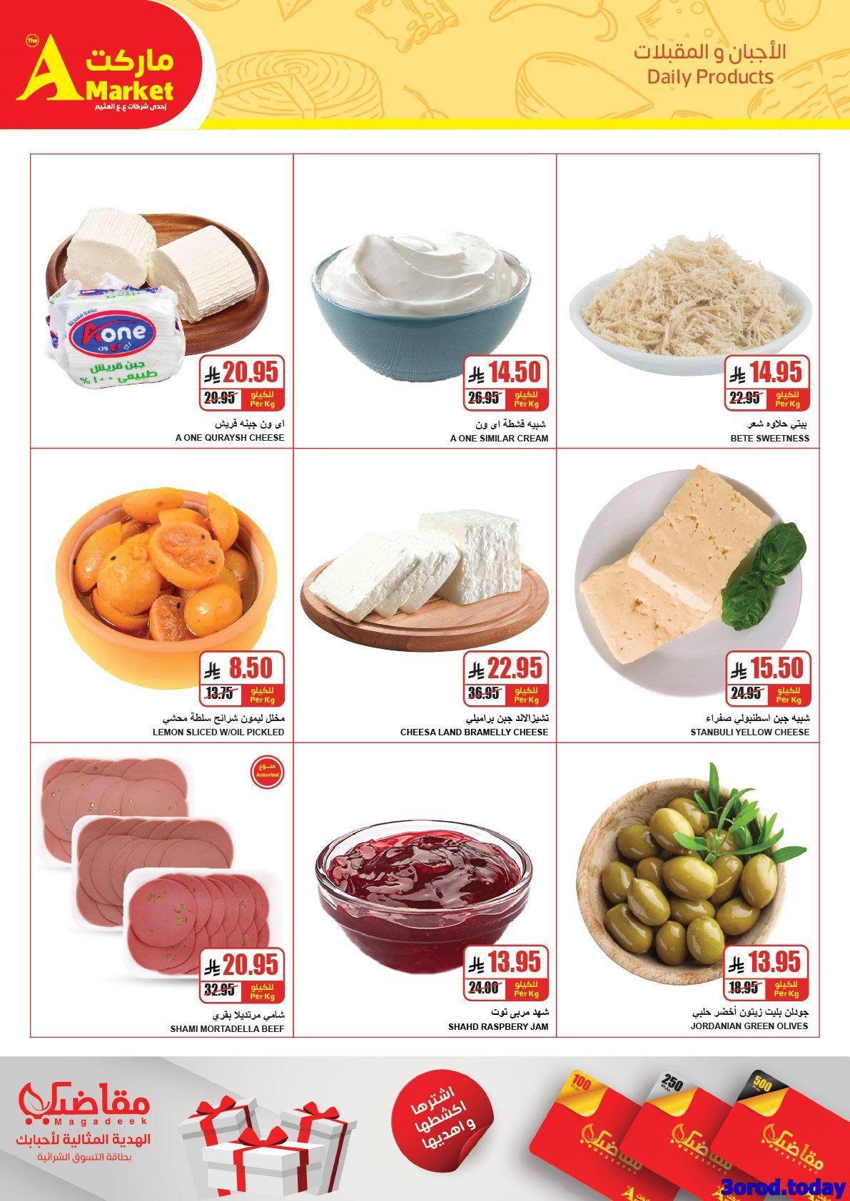 تحتوي عروض ايه ماركت الرياض علي : جبنة رومي قديم – لانشون لحيمي ساده – لبن عبور لاند – جبنة بيضا ملح خفيف – لانشون لحيمي بالزيتون – حلاوة طحينية – مربى فراولة – جبنة شيدر أفانتي – عسل نحل – لانشون لحيمي بالفلفل – جبنة كيري – زبادي طبيعي – قشطة بلدي – جبنة فيتا – بولوبيف – حلاوة بالبندق – زيتون كلاماتا