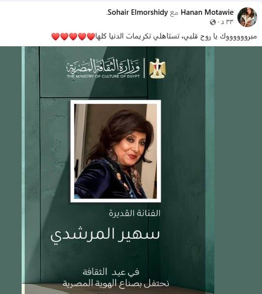 ونشرت حنان مطاوع صورة لوالدتها عبر حسابها على فيس بوك، معلقة عليها: "مبرووووووك يا روح قلبي، تستاهلي تكريمات الدنيا كلها".