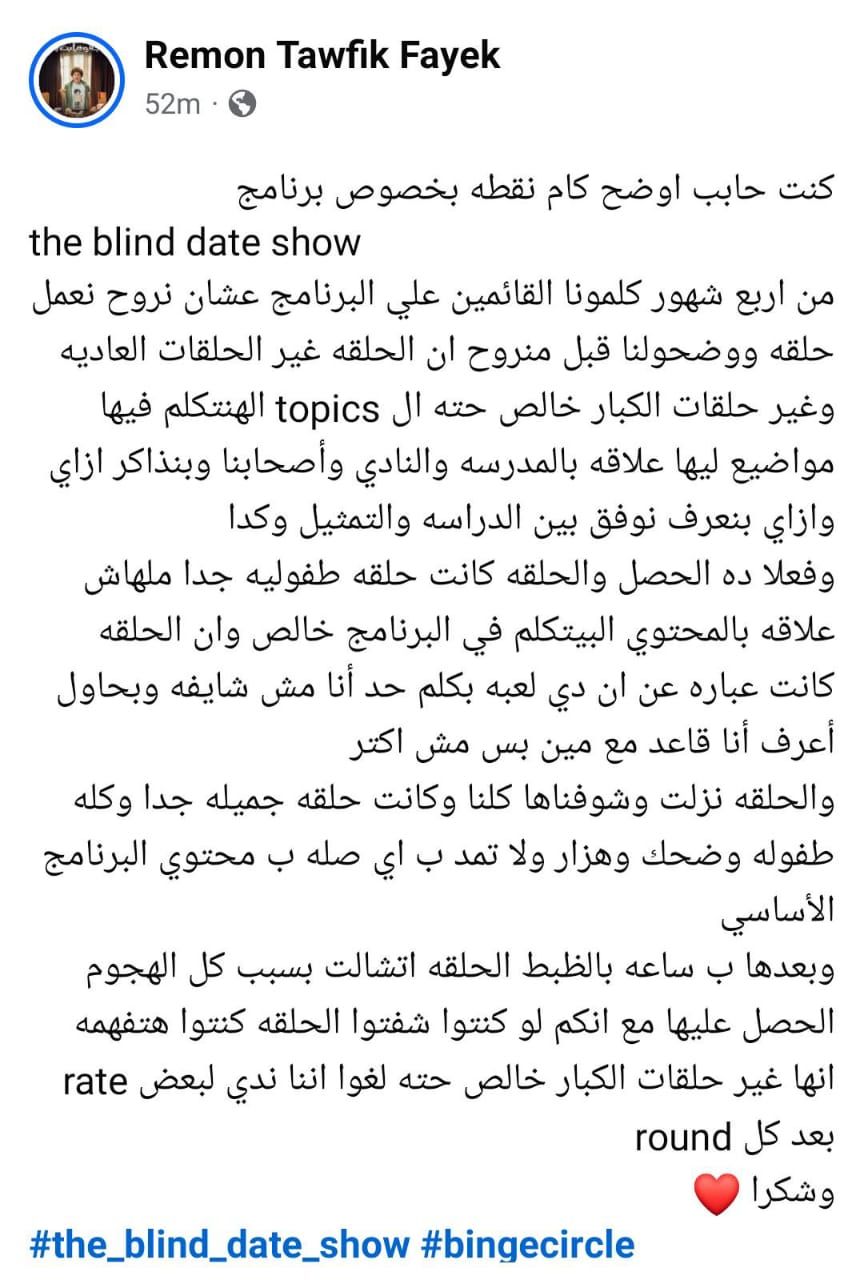 وأوضح ريمون توفيق: والحلقة نزلت وشوفناها كلنا وكانت حلقة جميلة جدا وكلها طفولة وضحك وهزار، ولا تمت بأى صلة بمحتوى البرنامج الأساسى، وبعدها بساعة بالظبط الحلقة اتشالت بسبب كل الهجوم اللى حصل عليها مع إنكم لو كنتوا شوفتوا الحلقة كنتوا هتفهموا إنها غير حلقات الكبار خالص، حتى لغوا إننا ندى لبعض rate بعد كل round، وشكرا.