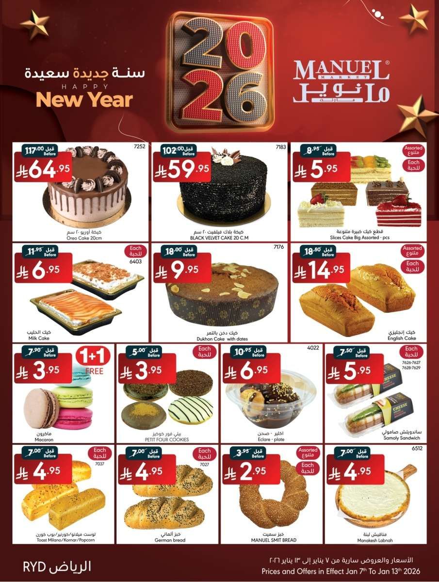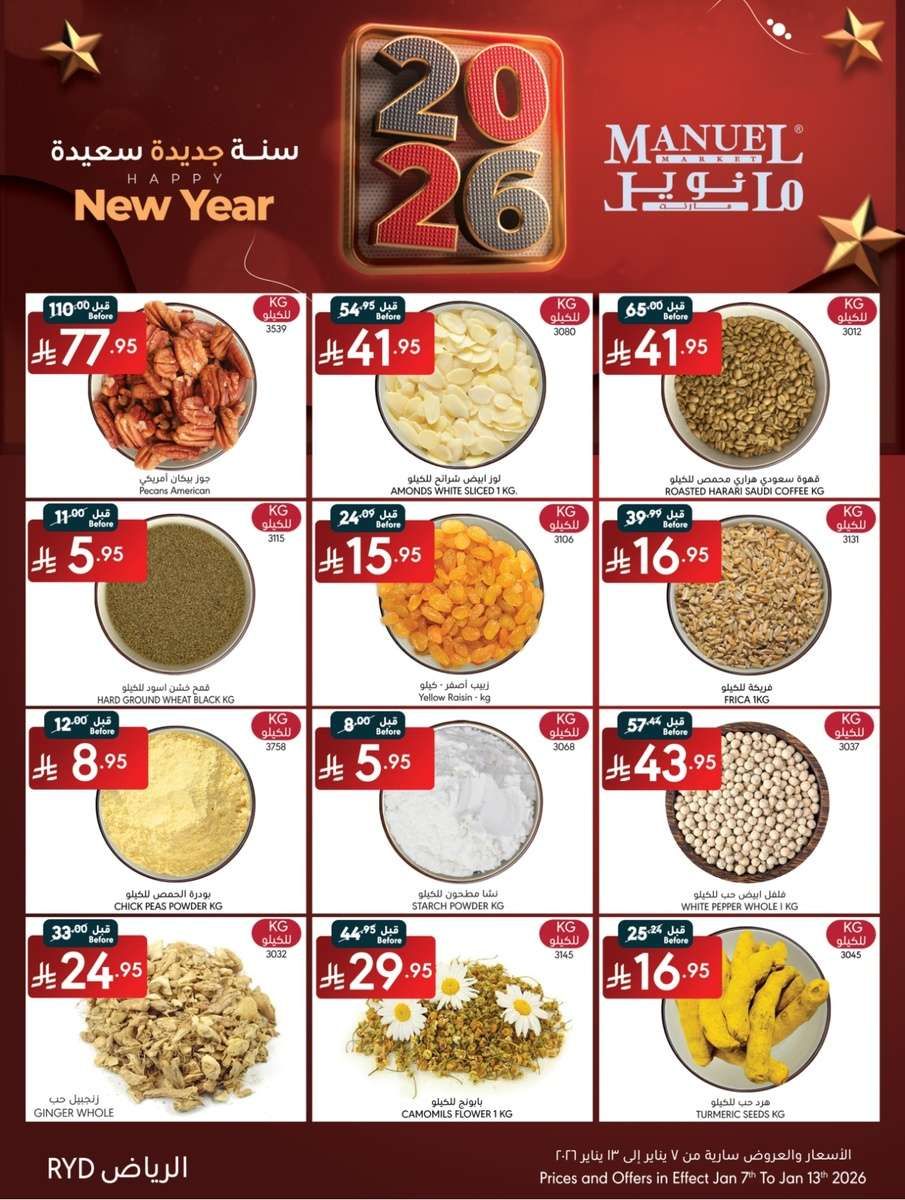 عروض مانويل الرياض الأربعاء 7 يناير 2026 الموافق 19 رجب 1447هـ و تشمل تشكيلة واسعة من السلع الأساسية والطازجة مثل الخضروات الطازجة كالكوسا والبروكلي والباذنجان والفلفل وأيضا الفواكه مثل التفاح والكمثرى والموز إلى جانب منتجات ألبان وكذلك أصناف جافة مثل دقيق الذرة والشوفان الكامل والمكرونة المشكلة والسميد الخشن