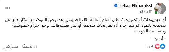 وقالت صفحة لقاء الخميسي عبر "": "أي فيديوهات أو تصريحات على لسان الفنانة لقاء الخميسي بخصوص الموضوع المثار حاليا غير صحيحة بالمرة، لم يتم إجراء أي تصريحات صحفية أو نشر فيديوهات، نرجو احترام خصوصية وحساسية الموقف.. الأدمن".