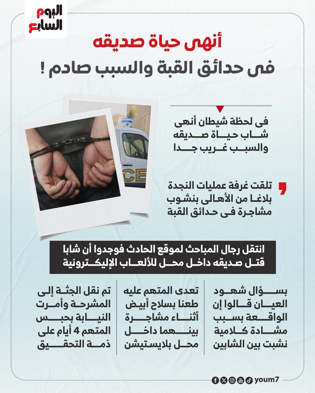 وبالفحص تبين العثور على جثة شاب به طعنة فى القلب، وتم نقل الجثة إلى المشرحة بعدما تعدى عليه صديقه أمام محل بلاستيشن وتم اتخاذ الإجراءات القانونية اللازمة تجاه الواقعة.