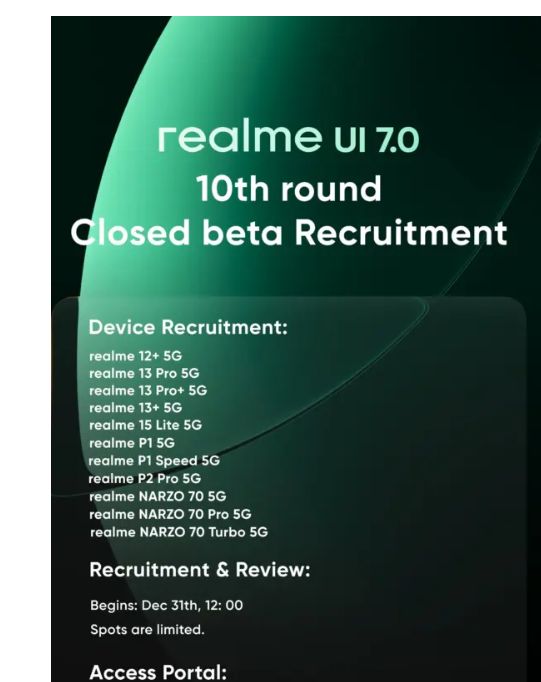 أعلنت شركة ريلمي عن النسخة التجريبية لتحديث Realme UI 7.0، مضيفةً بذلك أحد عشر هاتفًا ذكيًا جديدًا إلى القائمة. تشمل هذه الهواتف لطرازين من سلسلة Narzo، وهواتف من سلسلة P، وكشفت الشركة عن إصدارات البرامج الثابتة المطلوبة لتشغيل هذه الأجهزة ضمن البرنامج التجريبي.