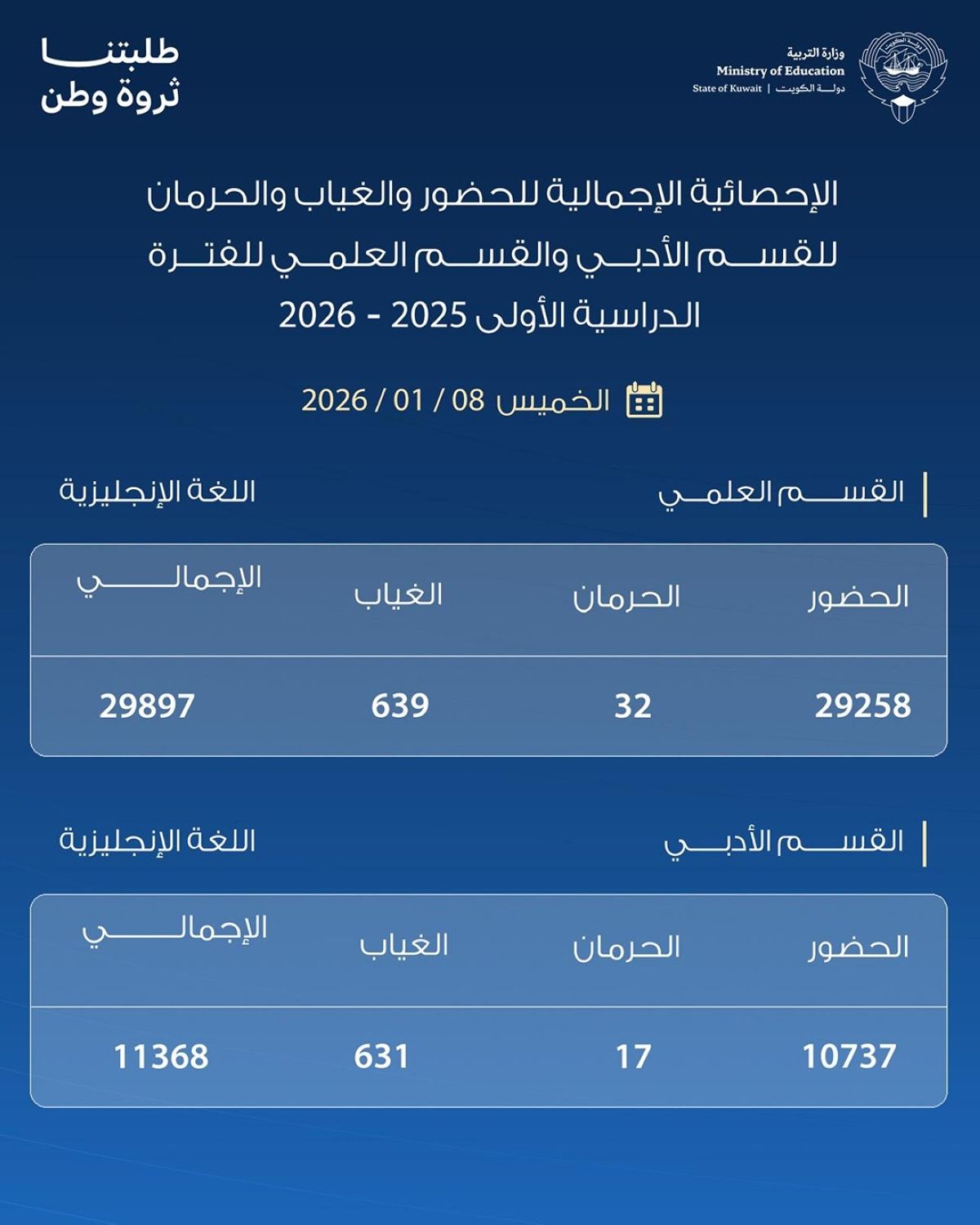 أعلنت وزارة التربية الإحصائية الإجمالية لحالات الحضور والغياب والحرمان لاختبار اللغة الإنجليزية لامتحانات الصف الثاني عشر للقسمين العلمي والأدبي، وذلك ضمن اختبارات الفترة الدراسية الأولى للعام الدراسي 2025 2026.