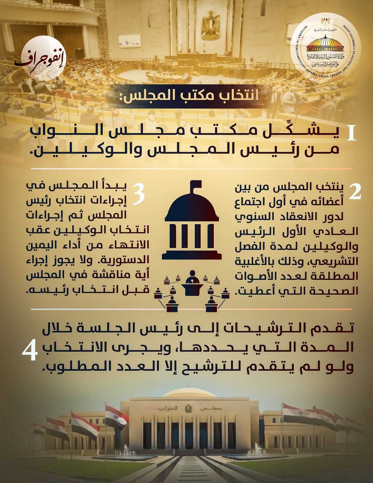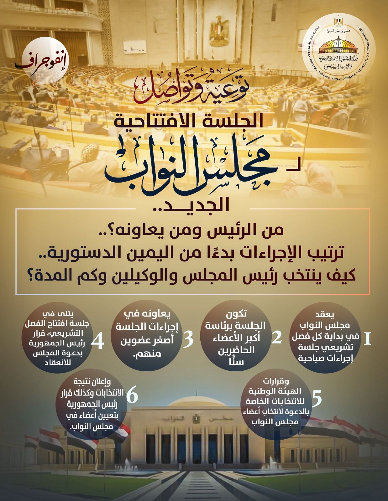 وتحت عنوان توعية وتواصل.. كل ما يخص الجلسة الافتتاحية لمجلس النواب الجديد.. من الرئيس ومن يعاونه؟.. ترتيب الإجراءات بدءًا من اليمين الدستورية.. كيف ينتخب رئيس المجلس والوكيلين وكم المدة؟.. أصدرت وزارة الشؤون النيابية إنفوجرافات جديدة، لتستكمل نشر المحتوى التوعوي.