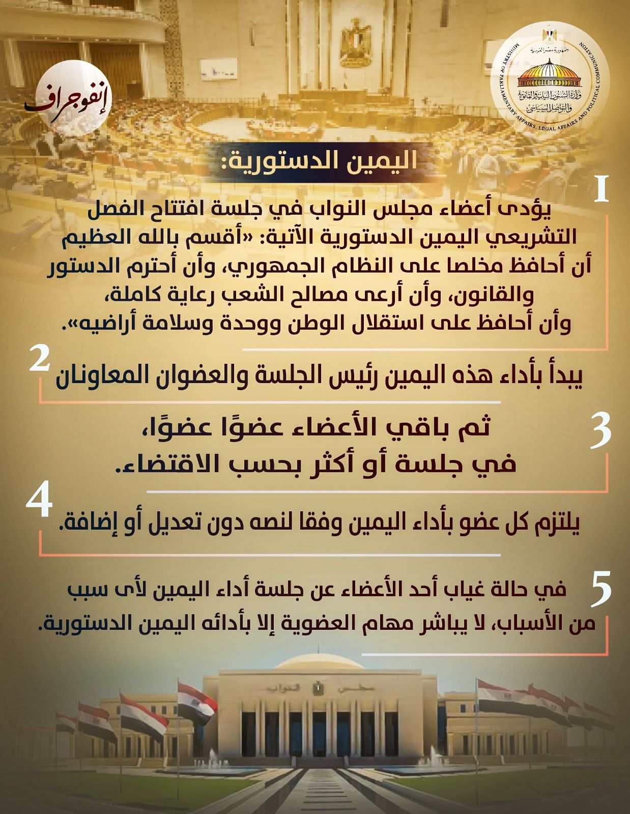 - يؤدى أعضاء مجلس النواب في جلسة افتتاح الفصل التشريعي اليمين الدستورية الآتية: "أقسم بالله العظيم أن أحافظ مخلصا على النظام الجمهوري، وأن أحترم الدستور والقانون، وأن أرعى مصالح الشعب رعاية كاملة، وأن أحافظ على استقلال الوطن ووحدة وسلامة أراضيه".