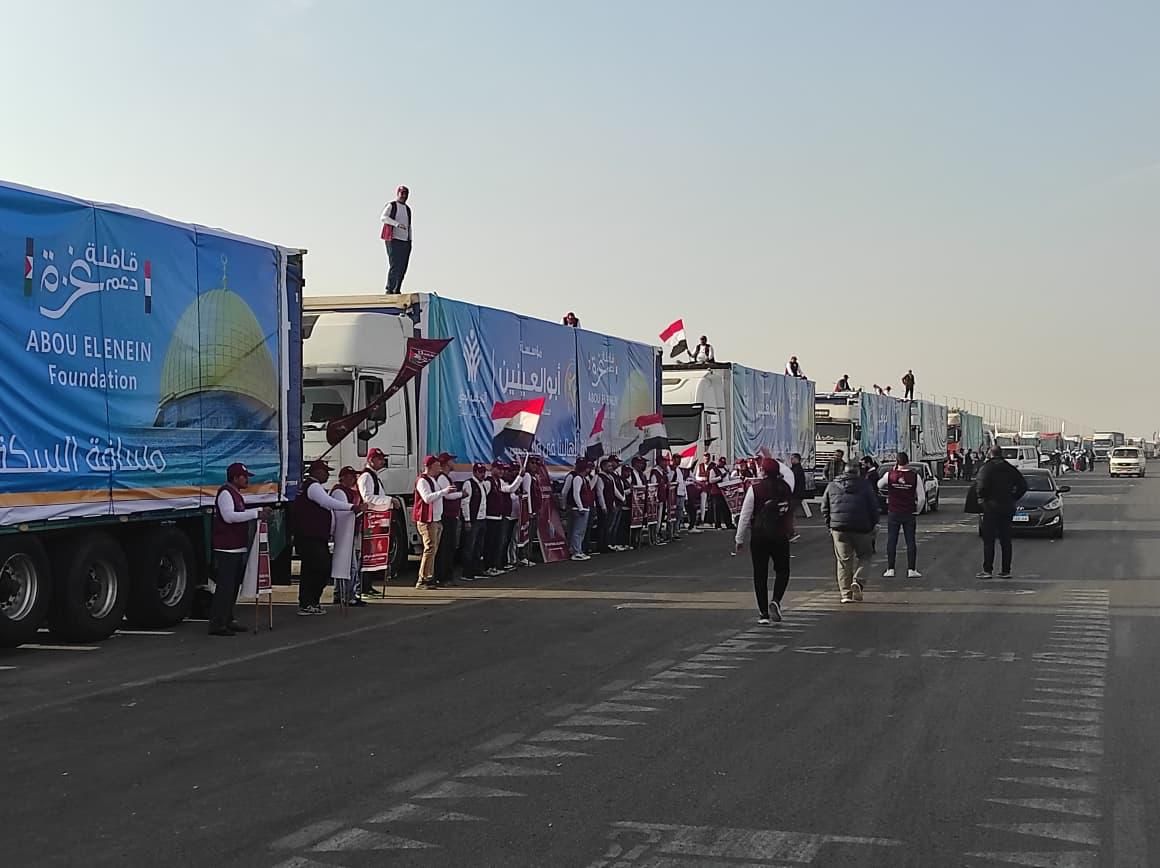 وتحركت القافلة صباح اليوم بآلاف الشاحنات بعد أن تفقدتها السفيرة نبيلة مكرم رئيس امانه سر التحالف الوطني للعمل الاهلي التنموي