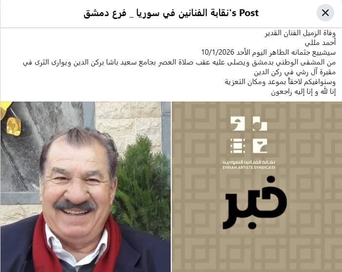نعت نقابة الفنانين السورية الفنان السورى أحمد مللى، والذي رحل خلال الساعات القليلة، ونشرت بيانا صحفيا عبر صفحتها الرسمية على الفيسبوك.
