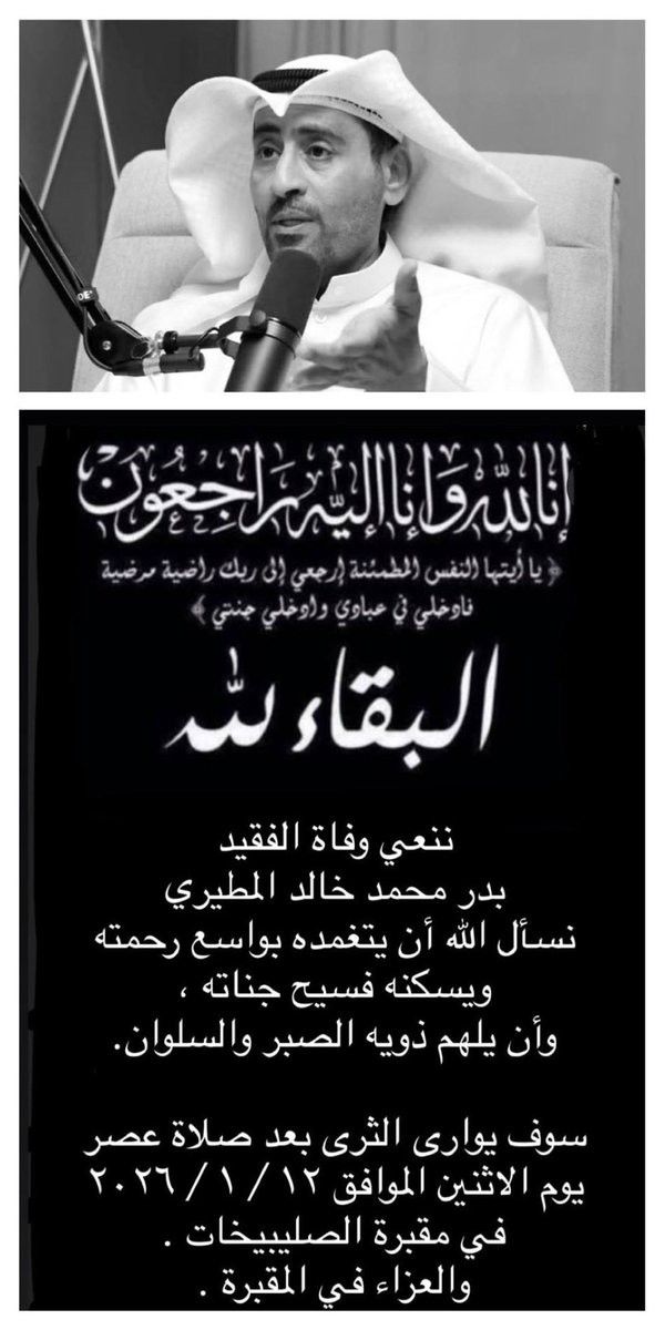 سبب وفاة بدر المطيري الكاتب الكويتي، حيث أعلنت وسائل إعلام كويتية، اليوم الأحد 11 يناير 2026، وفاة بدر المطيري الكاتب الكويتي المعروف.