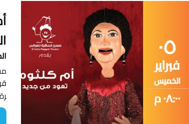 يقدم مسرح الساقية للعرائس حفل لكوكب الشرق السيدة أم كلثوم، مساء الخميس الموافق 5 فبراير المقبل 2026، على مسرح ساقية الصاوي، ومن المقرر أن تقدم خلالهم أغاني من أعظم أغانيها بمصاحبة فرقة مسرح الساقية للعرائس، وستبدأ الحفلة الأولي في تمام الساعة الثامنة وتقدم أغنيتان "فات الميعاد و انساك "ويأتى ذلك في إطار ما يقدمه مسرح الساقية للعرائس من حفلات غنائية ومسرحيات للأطفال بهدف الترويج لهذا النوع المميز من الفنون الذي يجذب الكبار قبل الصغار.