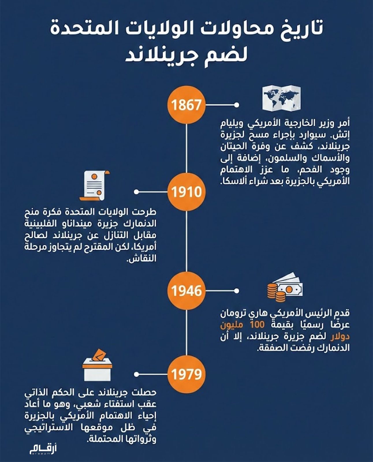 - لم تكن فكرة السيطرة على الجزيرة وليدة اللحظة، بل إن الاهتمام الأمريكي يعود إلى القرن التاسع عشر، مدفوعًا بموقعها الجيوسياسي الذي يربط القطب الشمالي بالمحيط الأطلسي، حيث طرح وزير الخارجية "ويليام إتش سيوارد" ضمها بعد شراء ألاسكا من روسيا عام 1867.