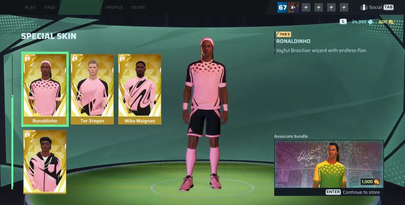 تُعد المجموعة الخاصة برونالدينيو واحدة من أبرز الإضافات التجميلية في لعبة Rematch، حيث يتيح هذا الزي اللعب بشخصية الساحر البرازيلي الشهير، المعروف بمهاراته الفائقة وأناقة تحركاته داخل الملعب. يمثل اختيار رونالدينيو فرصة مثالية للاعبين الذين يرغبون في تجربة اللعب بأسلوب مليء بالمهارة واللمسات الفنية، حيث يمكن تخصيصه باستخدام الألوان المفضلة لكل لاعب عن طريق تغيير أطقم اللعب (Kit). كما تتضمن المجموعة نسخة Streetwear تعكس أسلوب الملابس اليومية، لكنها تكلف أكثر من النسخة الأصلية وقد لا تتناسب بشكل مثالي مع طبيعة اللعبة الكروية.