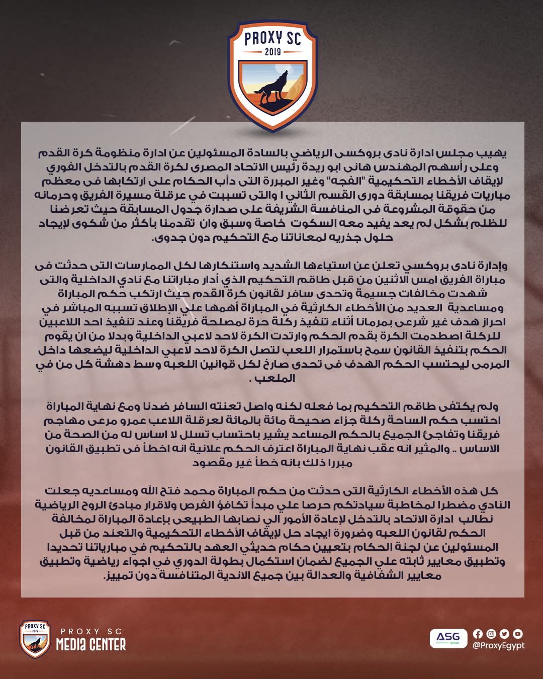 بيان بروكسي عن التحكيموجاء بيان بروكسى كالتالي: "يهيب مجلس إدارة نادى بروكسى الرياضي بالسادة المسئولين عن إدارة منظومة كرة القدم وعلى رأسهم المهندس/ هانى أبو ريدة رئيس الإتحاد المصرى لكرة القدم بالتدخل الفوري لإيقاف الأخطاء التحكيمية "الفجه" وغير المبررة التى دأب الحكام على إرتكابها فى معظم مباريات فريقنا بمسابقة دورى القسم الثاني (أ) والتى تسببت في عرقلة مسيرة الفريق وحرمانه من حقوقة المشروعة فى المنافسة الشريفة على صدارة جدول المسابقة حيث تعرضنا للظلم بشكل لم يعد يفيد معه السكوت خاصة وسبق وان تقدمنا بأكثر من شكوى لإيجاد حلول جذريه لمعاناتنا مع التحكيم دون جدوى".