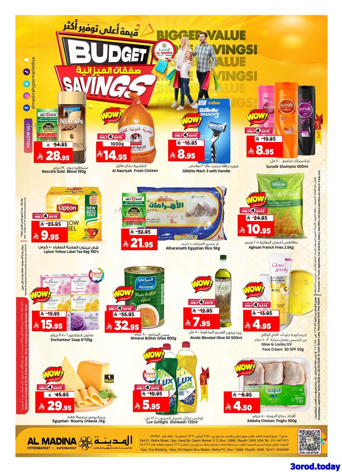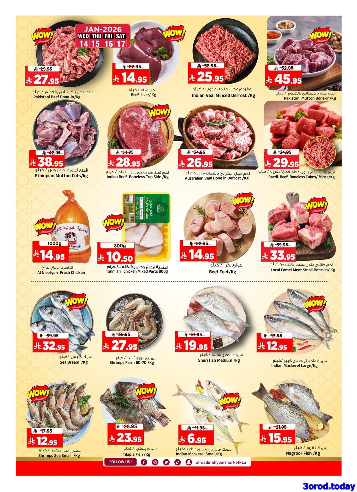 المدينة ماركت الأربعاء 14 يناير 2026 الموافق 25-7-1447هـ و تتضمن تشكيلة غذائية منها قطع لحم الجاموس والسمك البياض وزيت النخيل مع توفر كميات من الملح الصخري ودقيق الشعير والعدس البني والحليب المجفف و بتوفر العديد من الأجهزة المنزلية و يضم مكينة صنع الكبة ومبرد المشروبات الغازية الصغير ومكواة السيراميك الجافة ومنظم الجهد الكهربائي