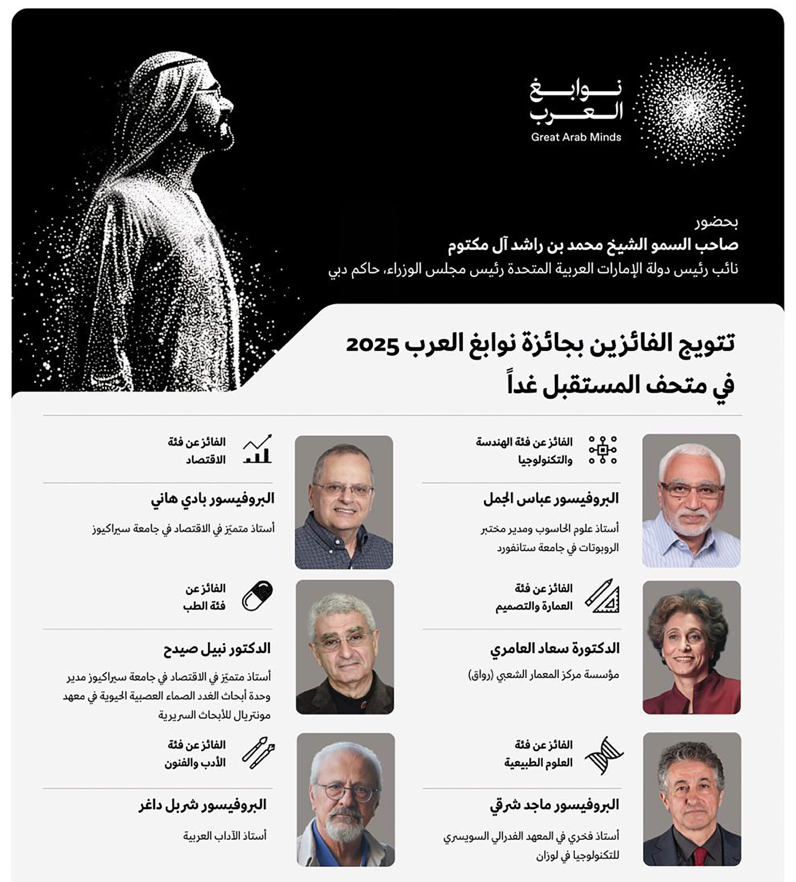 وسيشهد الحفل تكريم الفائزين الستة بجائزة «نوابغ العرب 2025»، وهم: البروفيسور ماجد شرقي عن فئة العلوم الطبيعية، والبروفيسور عباس الجمل عن فئة الهندسة والتكنولوجيا، والدكتور نبيل صيدح عن فئة الطب، والبروفيسور بادي هاني عن فئة الاقتصاد، والدكتورة سعاد العامري عن فئة العمارة والتصميم، والبروفيسور شربل داغر عن فئة الأدب والفنون لعام 2025.