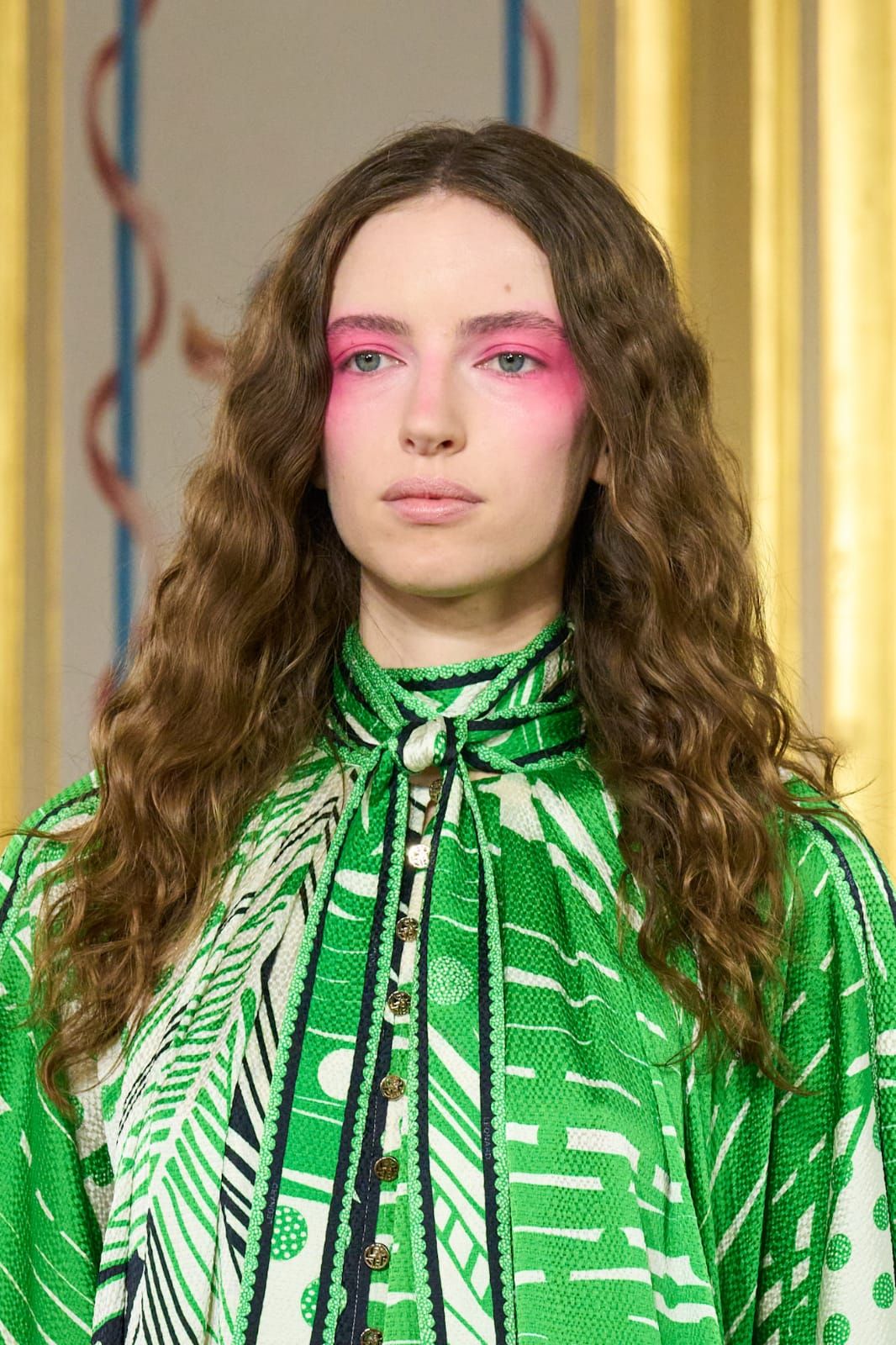 تعتمد هذه الإطلالة على ظلال عيون وردية قوية ممتدة حول العين بأسلوب حر وفني. اللون مطبق بشكل واضح وغير مدموج بالكامل؛ ليمنح النظرة طابعاً عصرياً جريئاً.