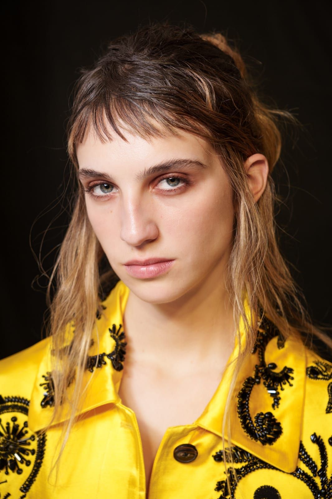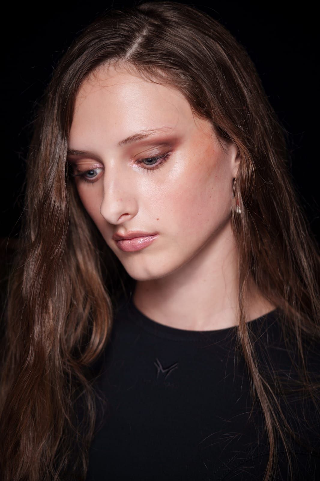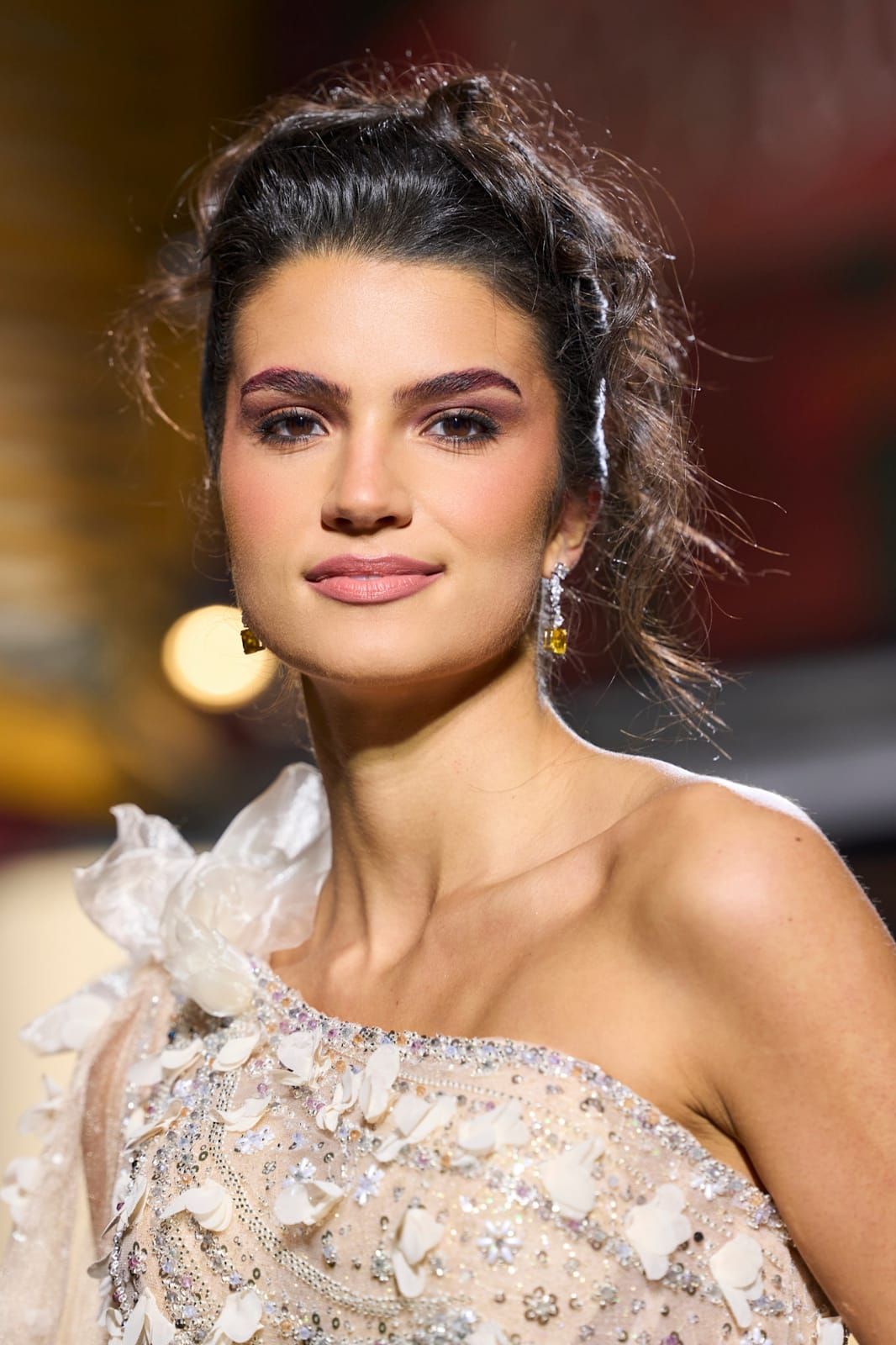 تعتمد هذه الإطلالة على مكياج عيون نحاسي دافئ بلمسة لامعة تعكس الضوء بنعومة. اللون مدموج بعناية على الجفن؛ ليمنح العين عمقاً وإشراقاً دون مبالغة.