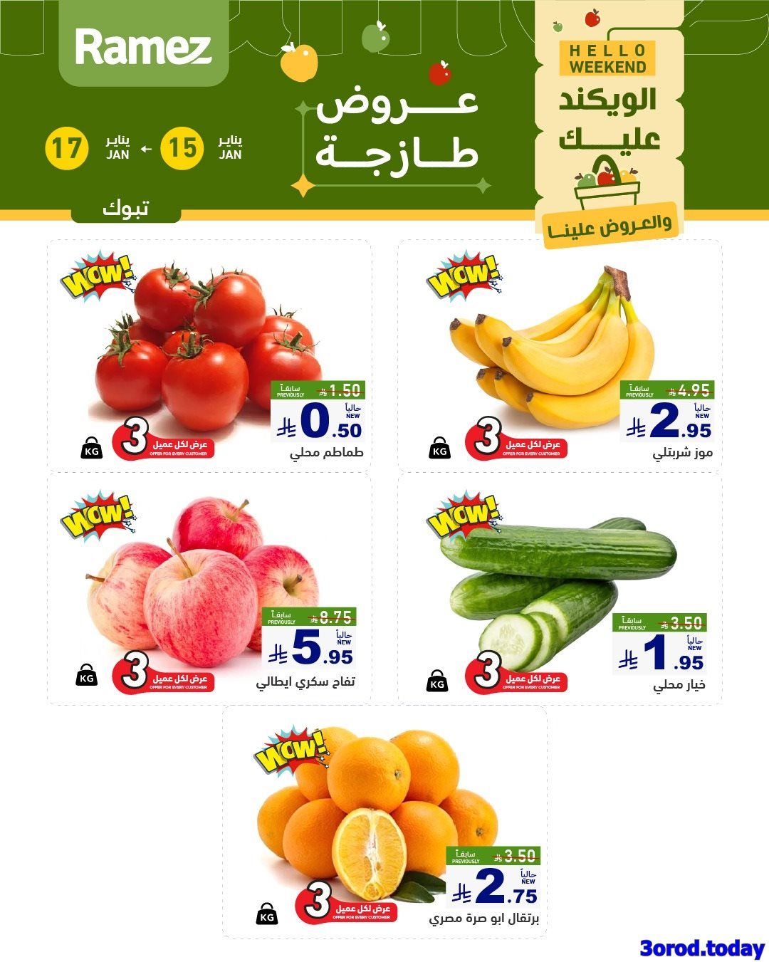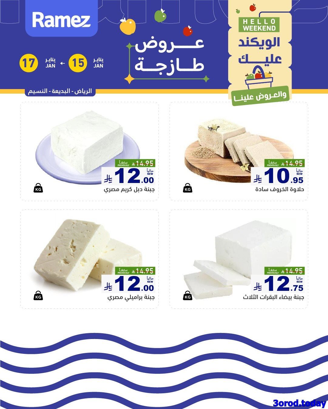عروض اسواق رامز السعودية الخميس 15-1-2026 الموافق 26 رجب 1447هـ و تحتوي علي الأجبان والزبادي والسلطات واللحوم الباردة والمخللات والفواكه مثل التفاح والفراولة والبرتقال والخضروات كالكرنب والخس والبطاطس و بتشمل ايضا اللحوم الحمراء والضأن والكبدة والكفتة والسمك الطازج والزيتون والمخللات والخضروات