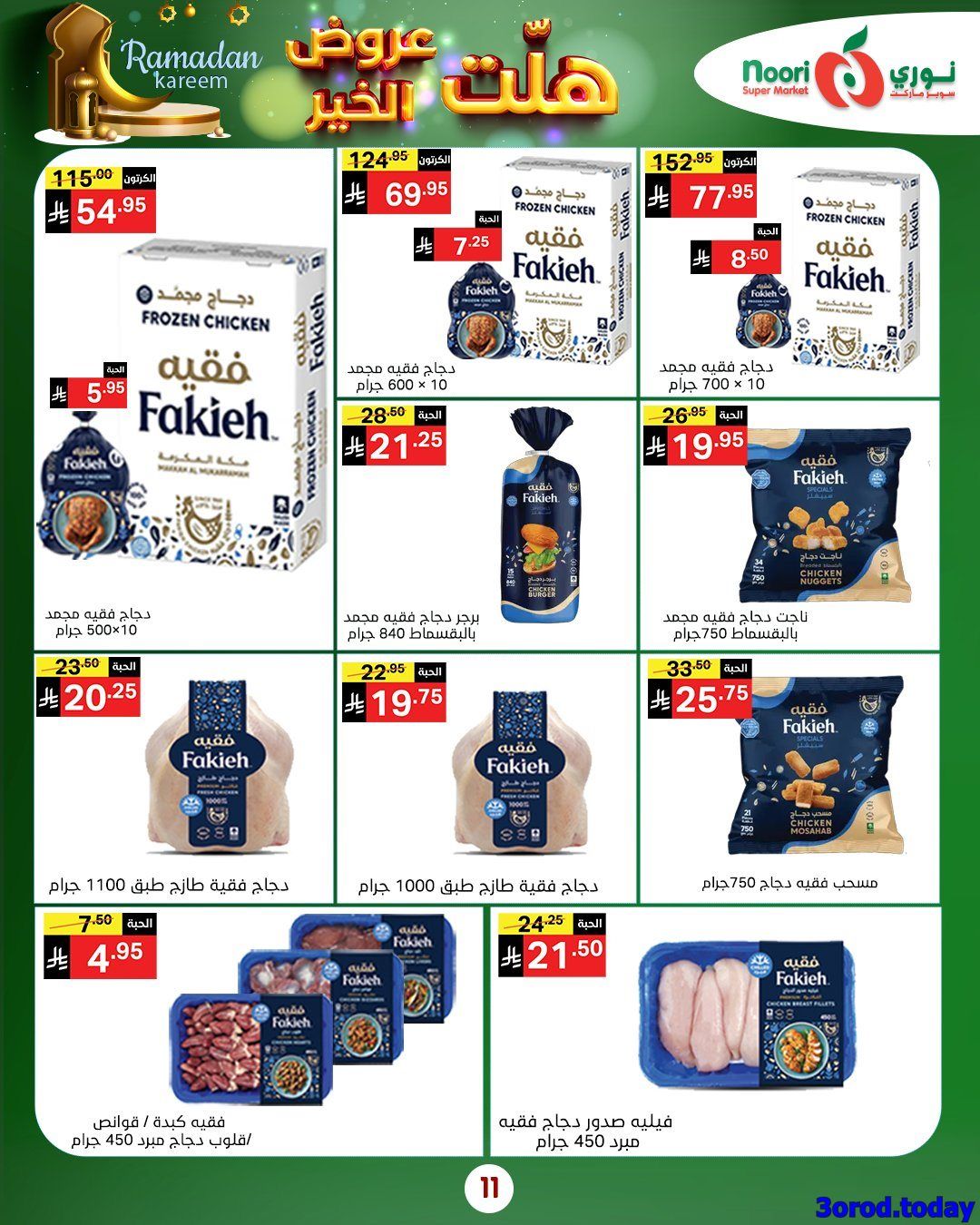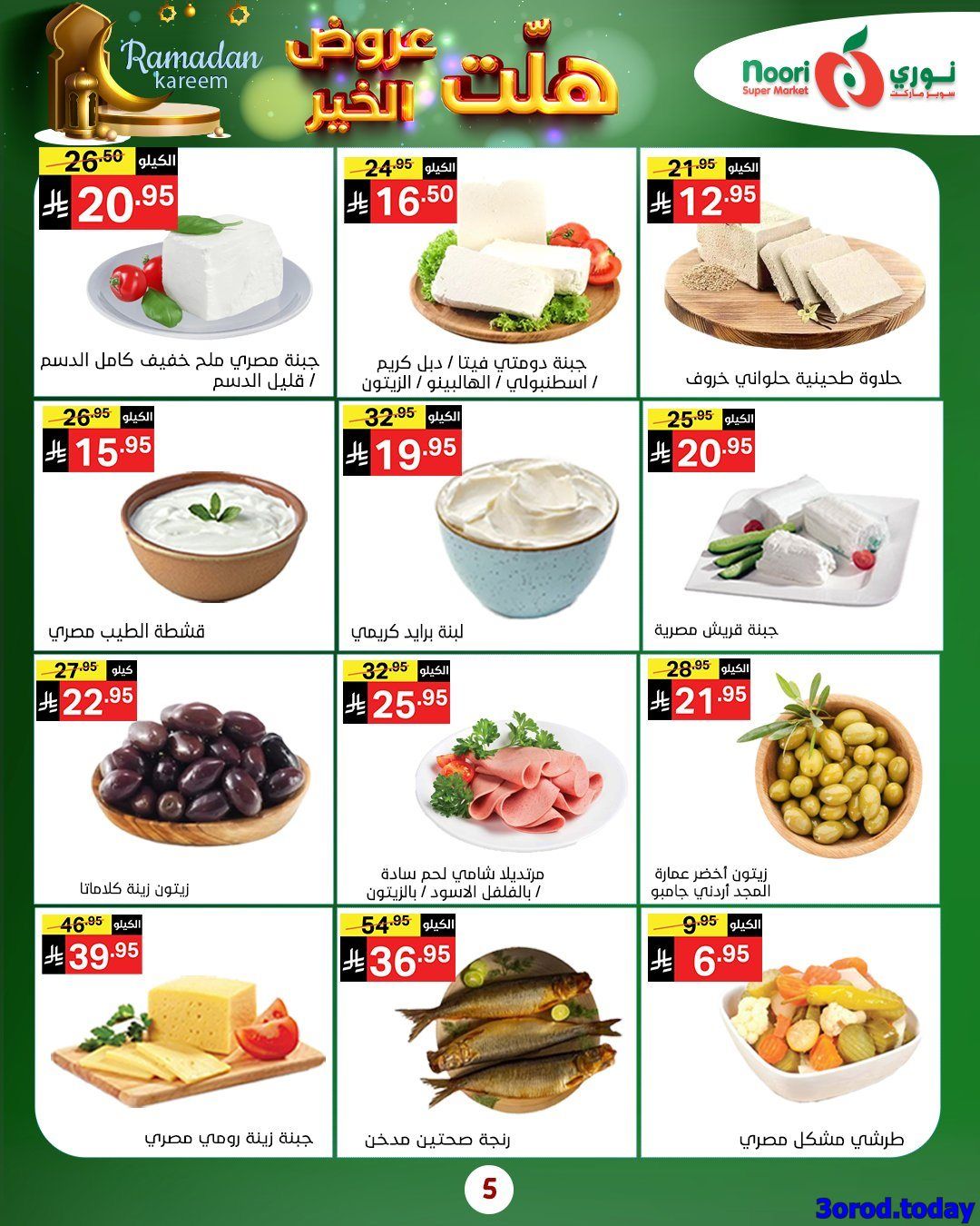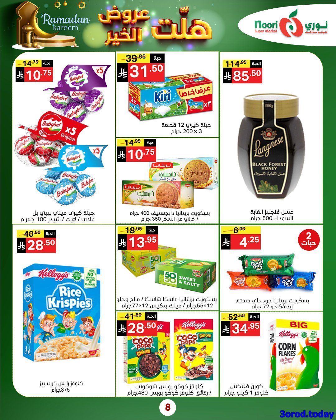 نوري ماركت الاسبوعية الاربعاء 14-1-2026 و تحتوي علي مجموعة واسعة من المنتجات الرمضانية منها الأرز والمعكرونة والعدس والحبوب والحلويات والشوكولاتة والمربيات والعصائر والحليب و بتوفر كمان الفواكه والخضروات الطازجة مثل البرتقال والبابايا والجزر والبطاطس والفاصوليا والقرنبيط والبصل والفلفل واللحوم والدجاج