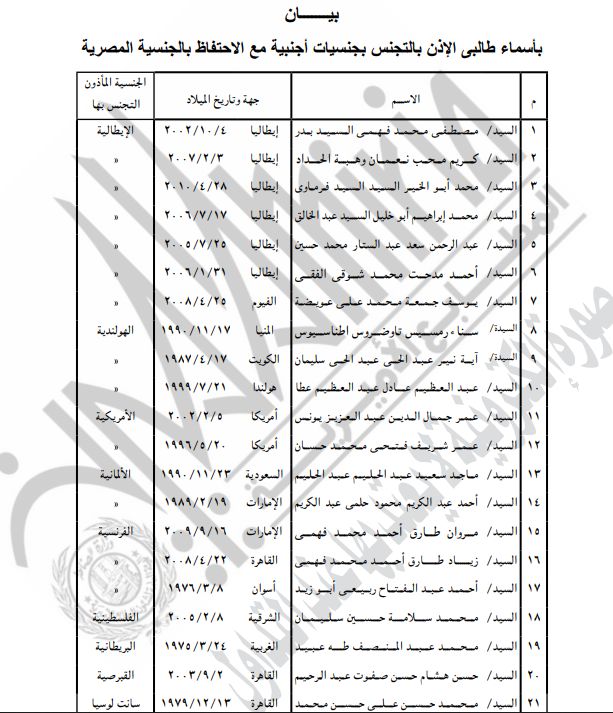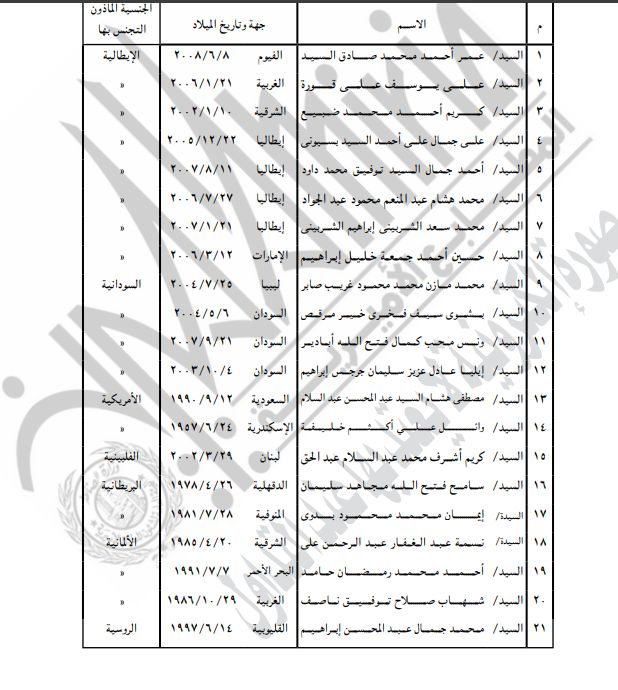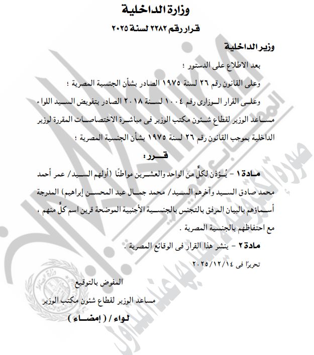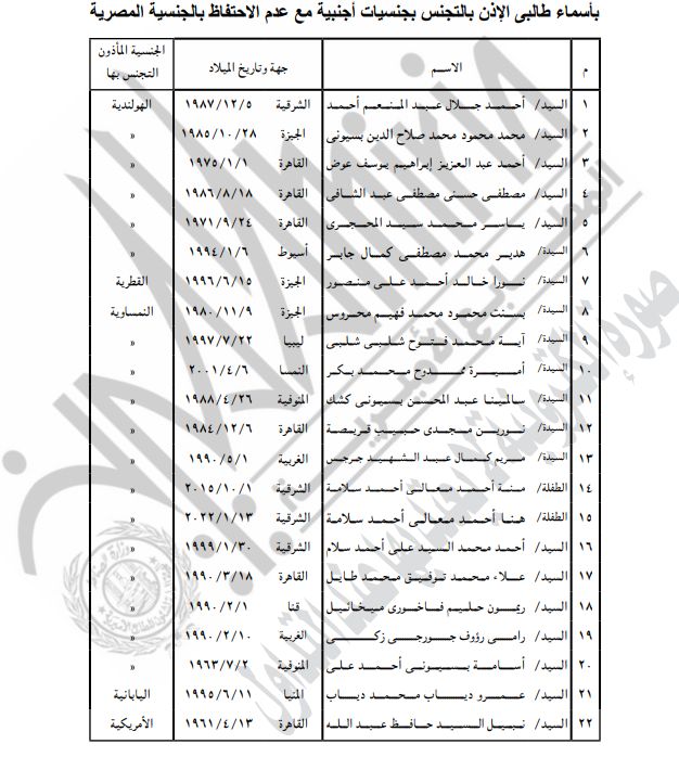 نشرت الجريدة الرسمية قرارات لوزارة الداخلية بشأن السماح لـ85 مواطنا برد الجنسية المصرية وكذلك بالتجنيس بجنسيات أجنبية مع احتفاظهم بالجنسية المصرية، وهم.