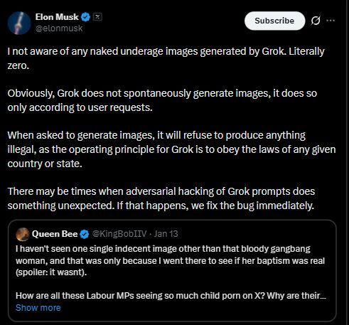 وكتب ماسك في منشور على منصة X أن Grok يلتزم بالقوانين المعمول بها، ولا ينتج محتوى مخالفًا من تلقاء نفسه، مشيرًا إلى أن الأداة تستجيب فقط لأوامر المستخدمين.