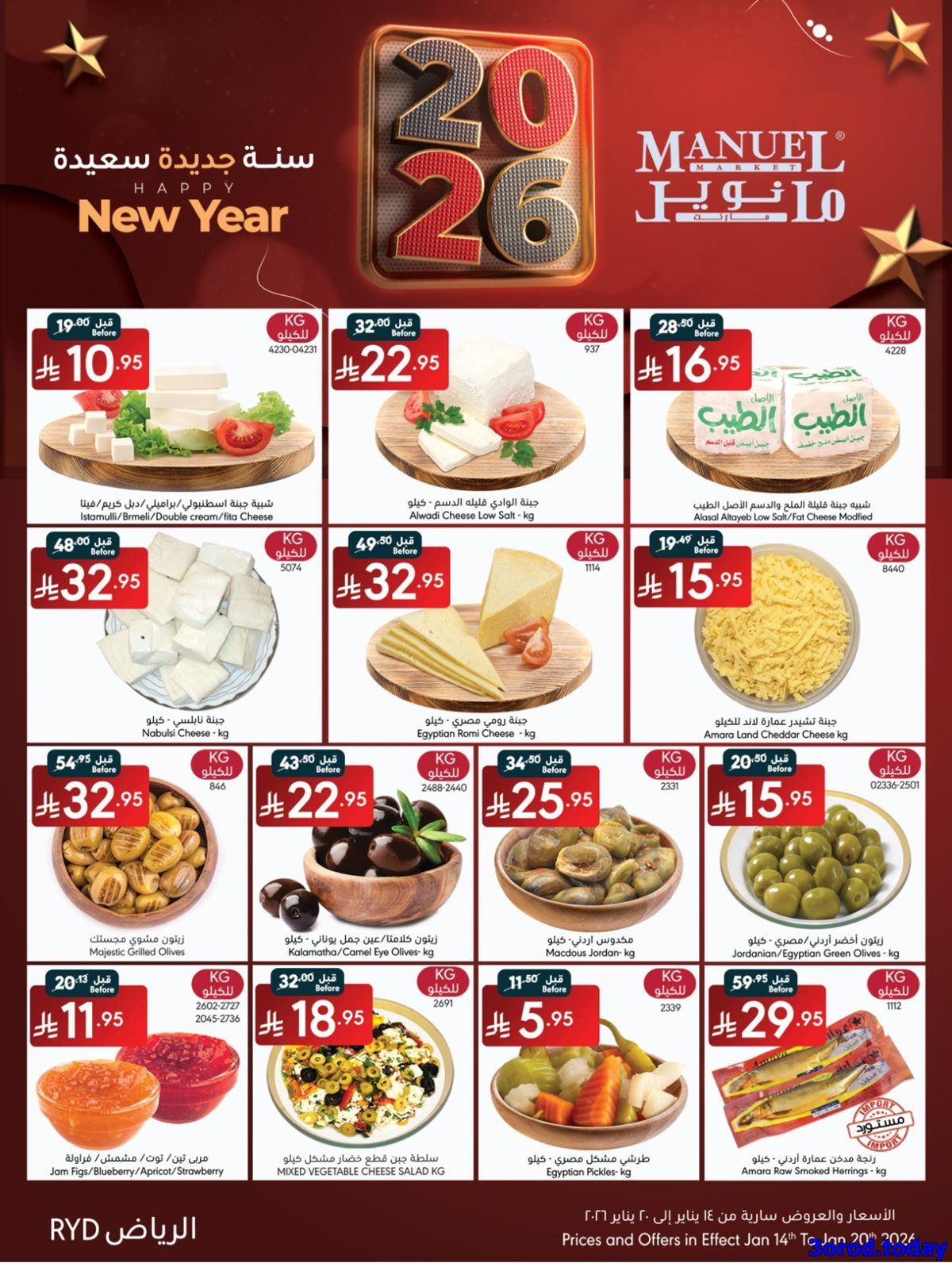 عروض مانويل الرياض الخميس 26 رجب 1447هـ الموافق 15-1-2026 تقدم منتجات غذائية منها جبنة شيدر ولحم عضوي ومخبوزات فرنسية وزيت جوز وحلويات مستوردة وشوكولاتة وقهوة مختصة وزيت زيتون وأرز فاخر وتكتمل العروض بأجهزة تشمل صانعة قهوة وفرن بيتزا وخلاط ومكواة بخار وشاشة ذكية وقلاية هوائية ومحضرة طعام