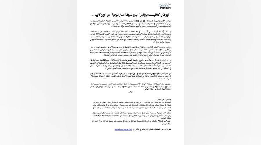 من جانبه، أكد ديفيد غروس، الشريك الإداري في «بين كابيتال»، أن المنطقة توفر فرصاً استثمارية واعدة، معرباً عن تطلعه إلى شراكة طويلة الأمد مع «أبوظبي كاتاليست بارتنرز» لتحقيق قيمة مستدامة خلال المرحلة المقبلة.