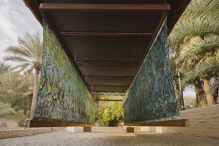 وفي واحة العين، تقدم نايكي ديفيز-أوكونداي، تركيباً فنياً من النسيج يجمع بين تقنيات التطريز والتطعيم، وتقنية نسيج «أديري» المعتمدة على صباغة الأقمشة القطنية. وينطلق العمل من إشارة أولية إلى الخلفيات الرمزية التي كانت تُستخدم في مسرح اليوروبا المتنقل خلال خمسينيات القرن الماضي في نيجيريا، ليستلهم من شجرة النخيل ومكانتها المحورية في النظام البيئي للواحة. ويتميز التركيب الفني ببنية نسيجية مستوحاة من أشجار النخيل المترابطة، في تعبير عن وحدة القبائل والقيم المشتركة بين الإمارات ونيجيريا.