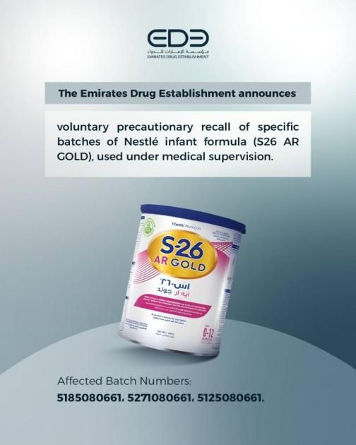 كشفت مؤسسة الإمارات للدواء عن وجود منتج إضافي S26 AR ضمن نطاق السحب الطوعي والاحترازي لمنتجات حليب الأطفال «نستله» والمستخدمة تحت إشراف طبي فقط، وحفاظاً على الصحة والسلامة، أعلنت المؤسسة التشغيلات المتأثرة بقرار السحب وهي: 5185080661,5271080661,5125080661.