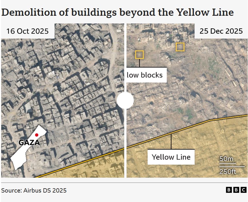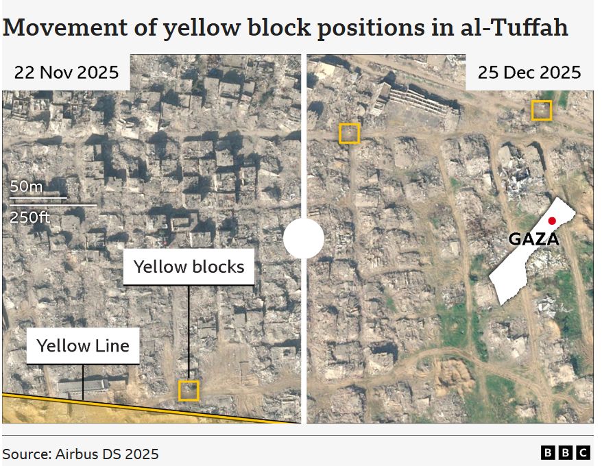 كشف تحقيق نشرته هيئة الإذاعة البريطانية (BBC)، ترجمته وكالة سوا، أن الجيش الإسرائيلي نقل الكتل الخرسانية الصفراء التي يفترض أن تحدد خط السيطرة بعد وقف إطلاق النار إلى عمق قطاع غزة في عدة مواقع، ما أدى إلى حالة من البلبلة وعدم اليقين بين السكان الفلسطينيين بشأن حدود المناطق الخطرة.