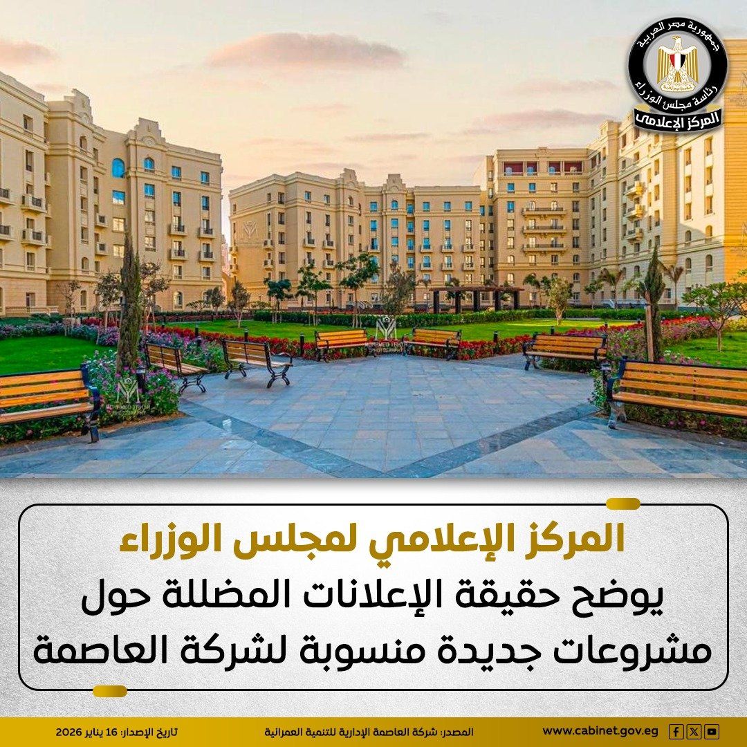 الجمعة، 16 يناير 2026 01:51 منشر المركز الإعلامي لمجلس الوزراء بيانًا عبر منصاته على مواقع التواصل الاجتماعي، أوضح من خلاله حقيقة ما تم تداوله حول إعلان شركة العاصمة الإدارية للتنمية العمرانية طرح مشروعات جديدة بأسعار أقل من المتعارف عليها.