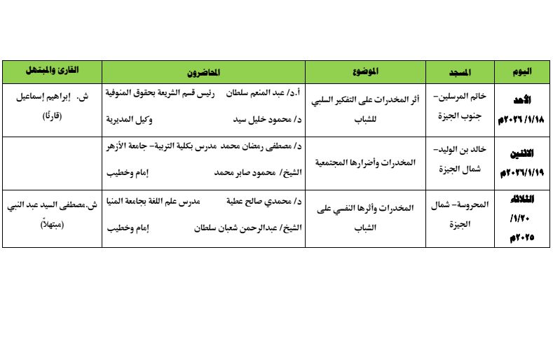 تعقد الوزارة الأسبوع الثقافي بمديرية أوقاف الجيزة بمساجد (خاتم المرسلين - خالد بن الوليد- المحروسة) من يوم الأحد 1/18/ 2026 حتى يوم الثلاثاء 1/20/ 2026 عقب صلاة العشاء، وذلك فى إطار دور وزارة الأوقاف العلمى والدعوى والتثقيفى لتحقيق مقاصد الشريعة وتقديم خطاب دينى وسطي رشيد.